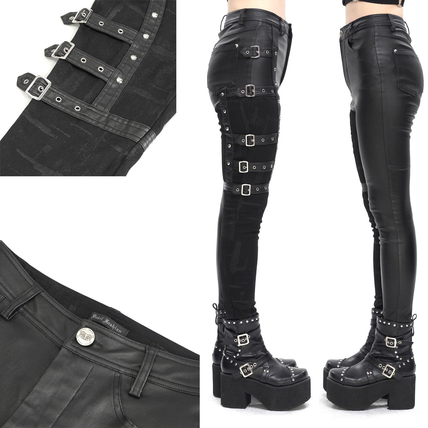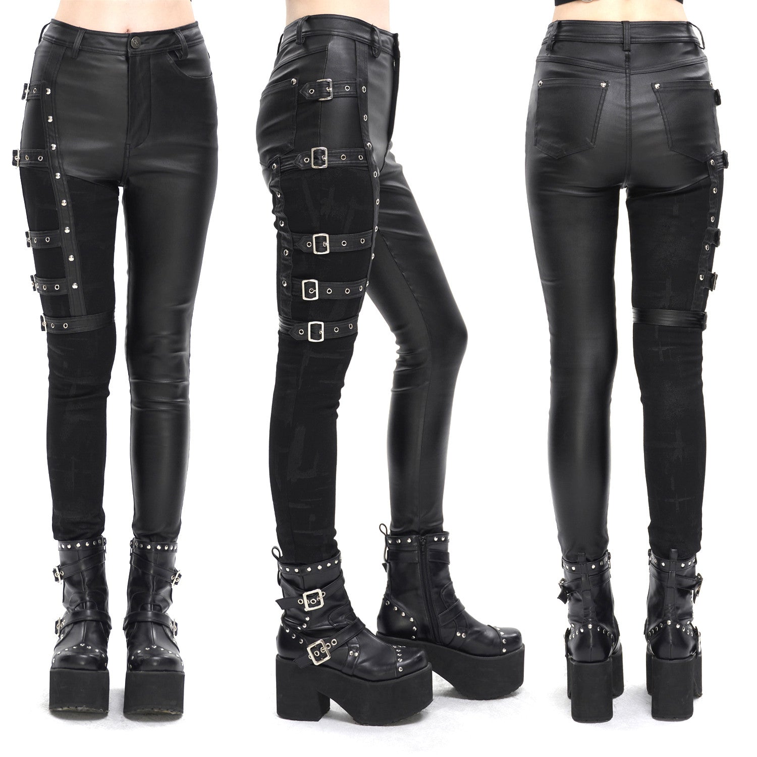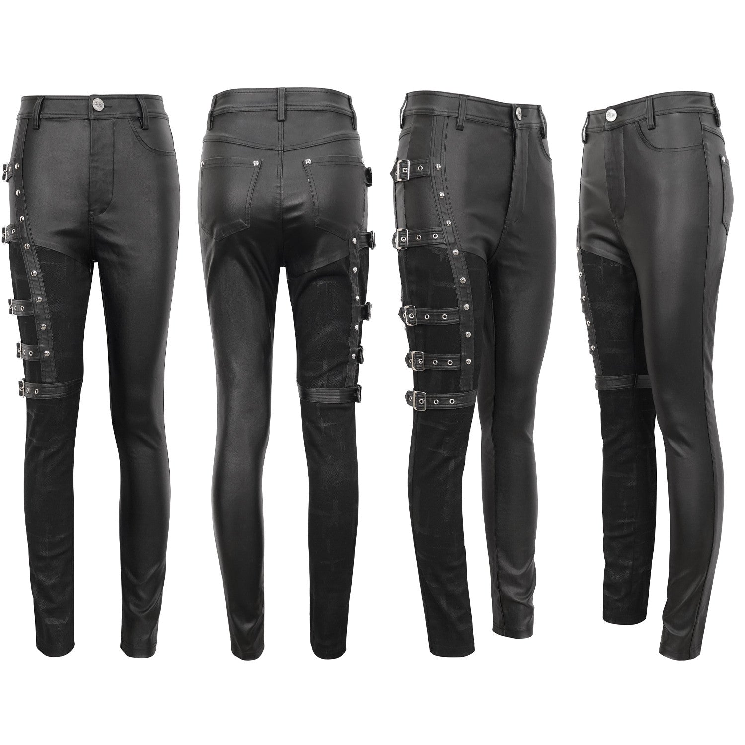 Stand out in these asymmetrical buckled pants with functional pockets on one leg. The combination of shiny fabric and a more opaque leg adds a unique touch to your alternative style. These asymmetrical buckled pants are made from a blend of 55% rayon, 30% cotton, 10% polyamide, and 5% spandex for comfort and flexibility.