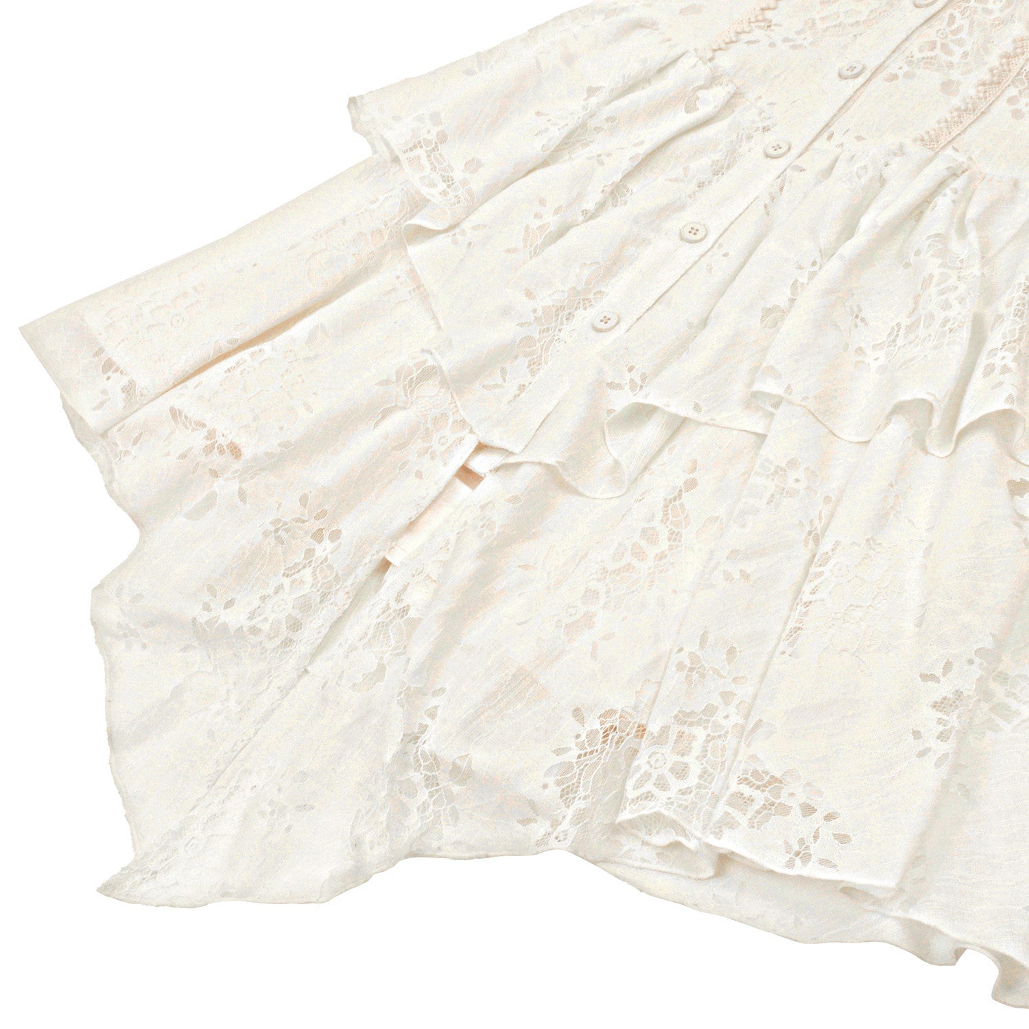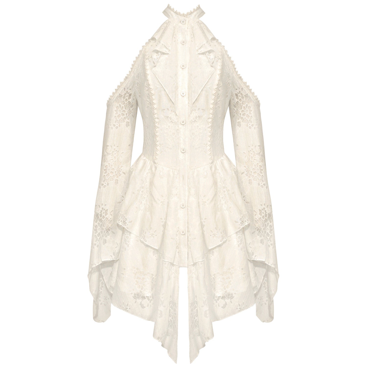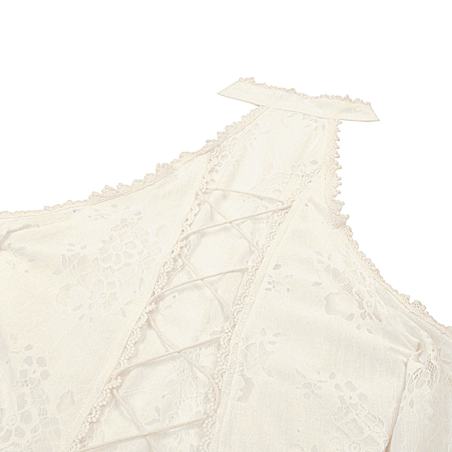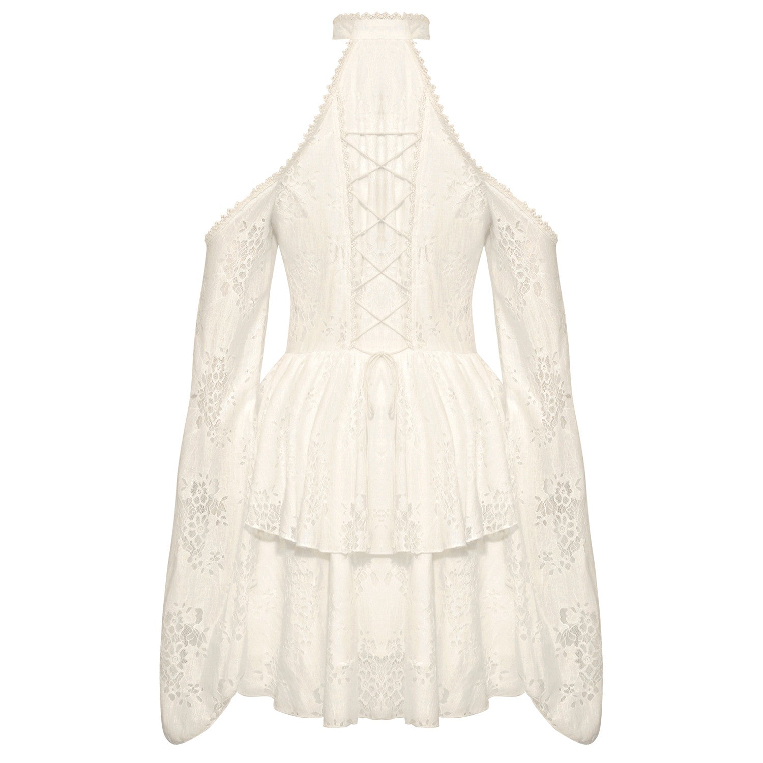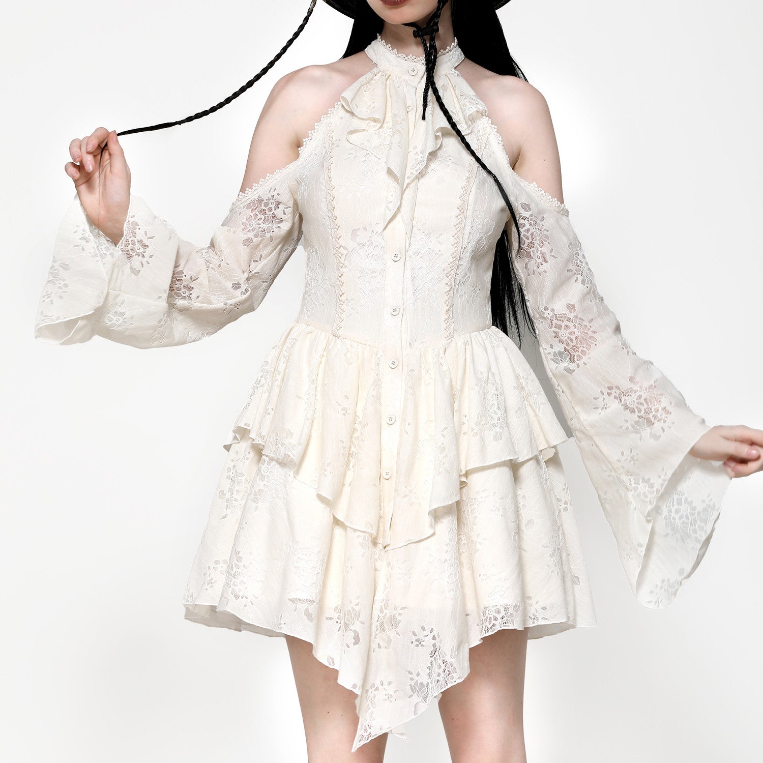 Beige dress made of stretch lace. It features an adjustable back and asymmetrical design, off-the-shoulder styling, and long sleeves. Don't miss out!
