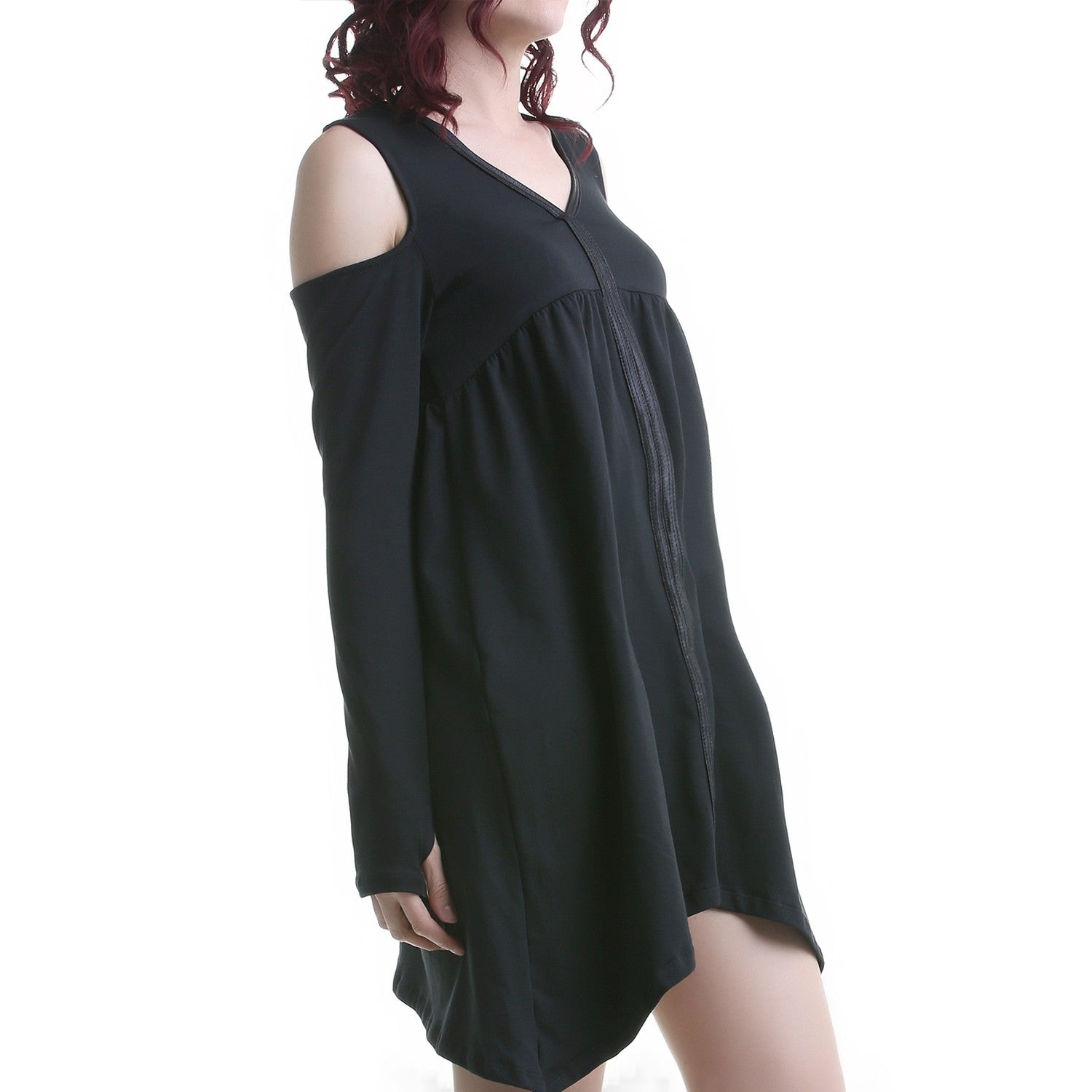 Wide black dress with faux leather straps at the front. Long sleeves. Open shoulders.