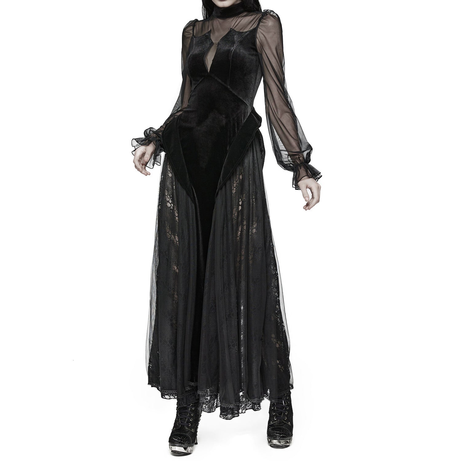 Discover gothic elegance with this tulle and velvet dress. The bodice is crafted from soft velvet, while the long, wide sleeves are made of semi-sheer tulle, adding an ethereal touch. The equally stunning skirt blends lace and tulle for a sophisticated and unique finish. Ideal for special events and occasions where you want to stand out with an alternative style.