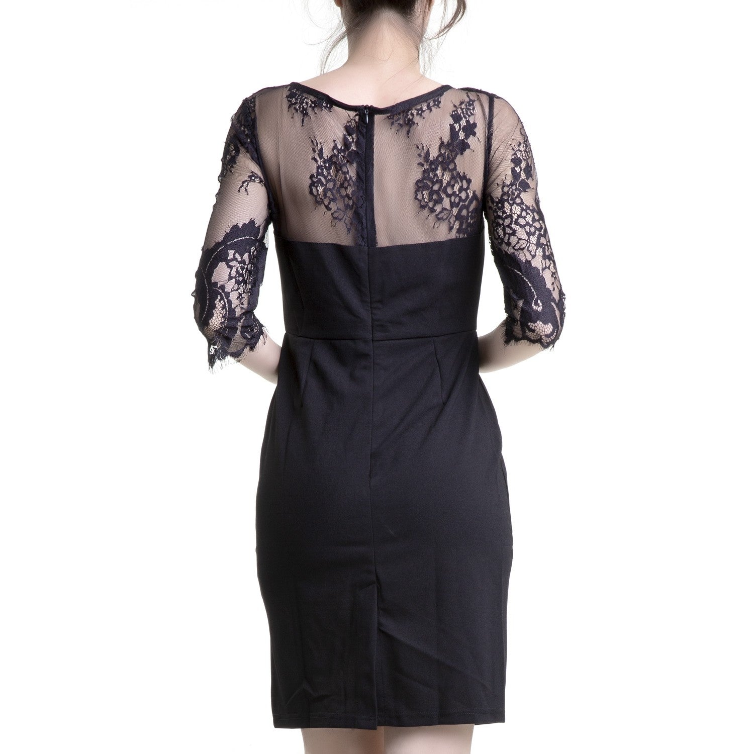 Black sheath dress with semi-long lace sleeves and zipper at the back.