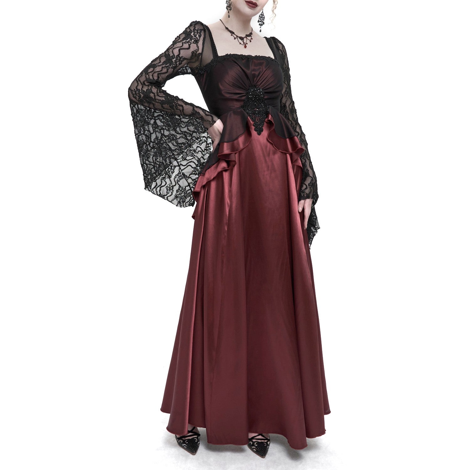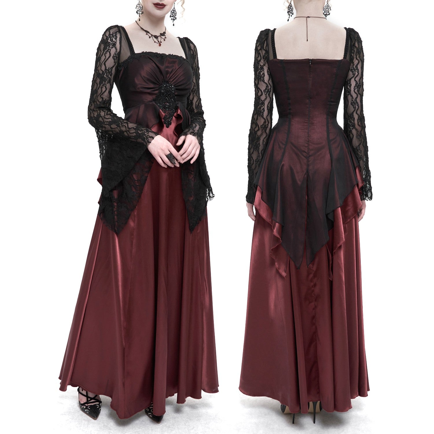 Elegant red dress with tulle and guipure trim at the front. Long, wide sleeves of sheer lace. Zipper at the back.