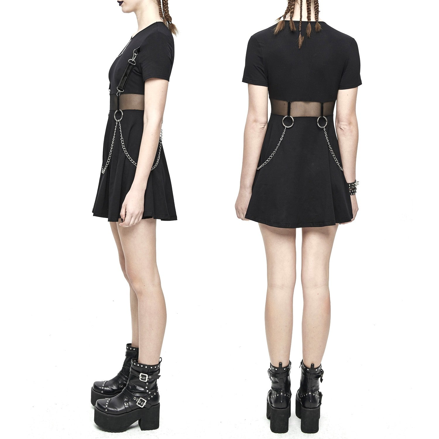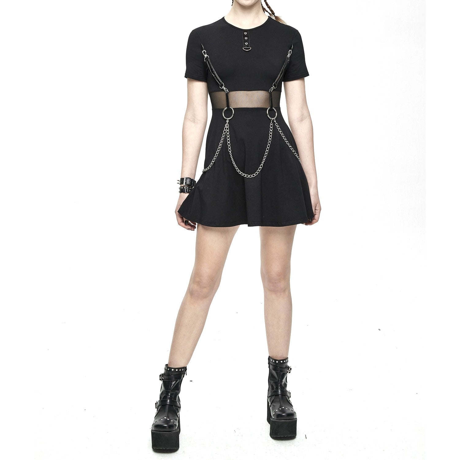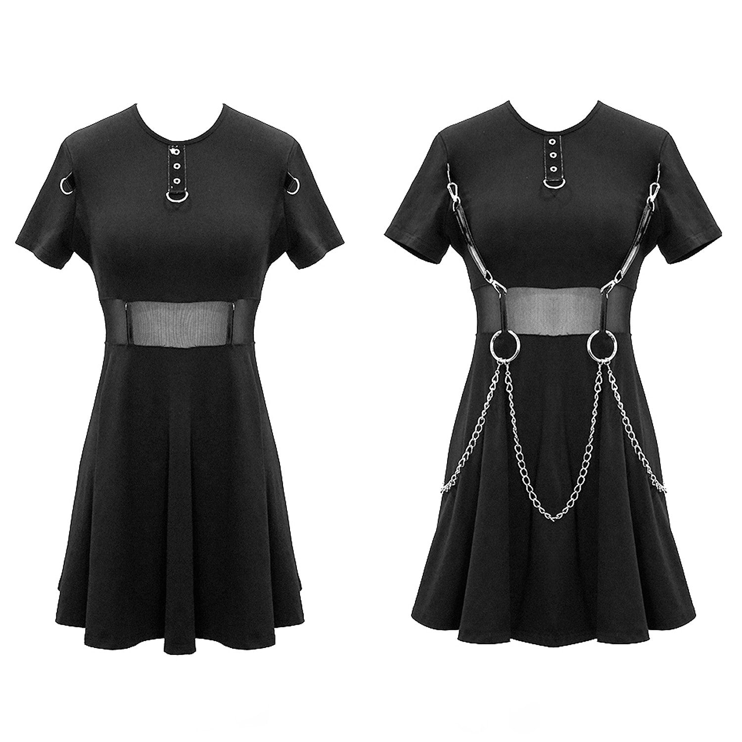 Short black dress with short sleeves. Removable chains and faux leather straps. Sheer tulle under the bust.