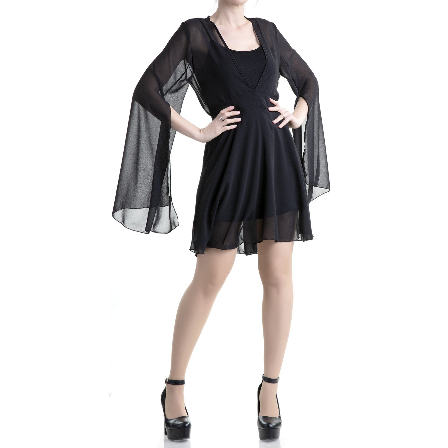 Two-piece dress, one black with straps and the other chiffon on top with long, wide sleeves and a V-neckline.