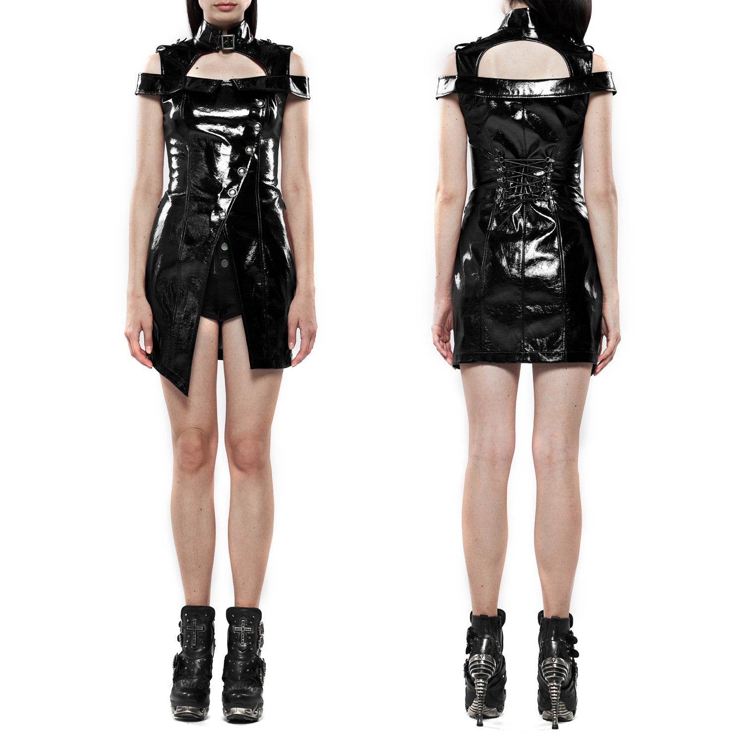 Very short, shiny black dress; we recommend wearing something underneath. Buttons run diagonally down the front. Open shoulders. Buckle collar. Open neckline. Crisscross back.
