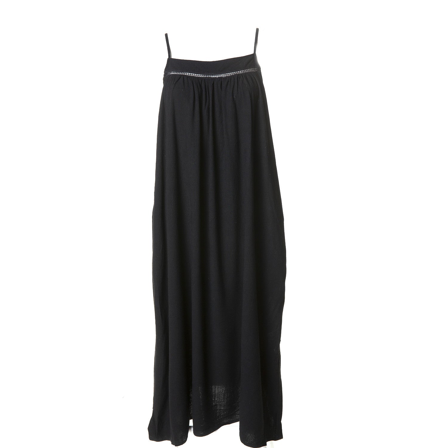 Long black dress with straps and guipure trim at the neckline. Lightweight and breezy, perfect for summer. Composition: 70% viscose, 30% linen. Model measurements: 86-72-100cm, Height: 170cm.