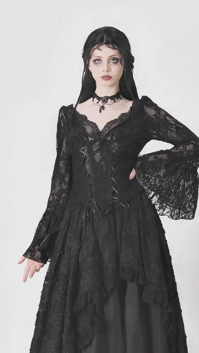 Blouse fabriquée en combinant plusieurs motifs de dentelle, manches à volants et devant avec des détails de lacets en satin croisés.