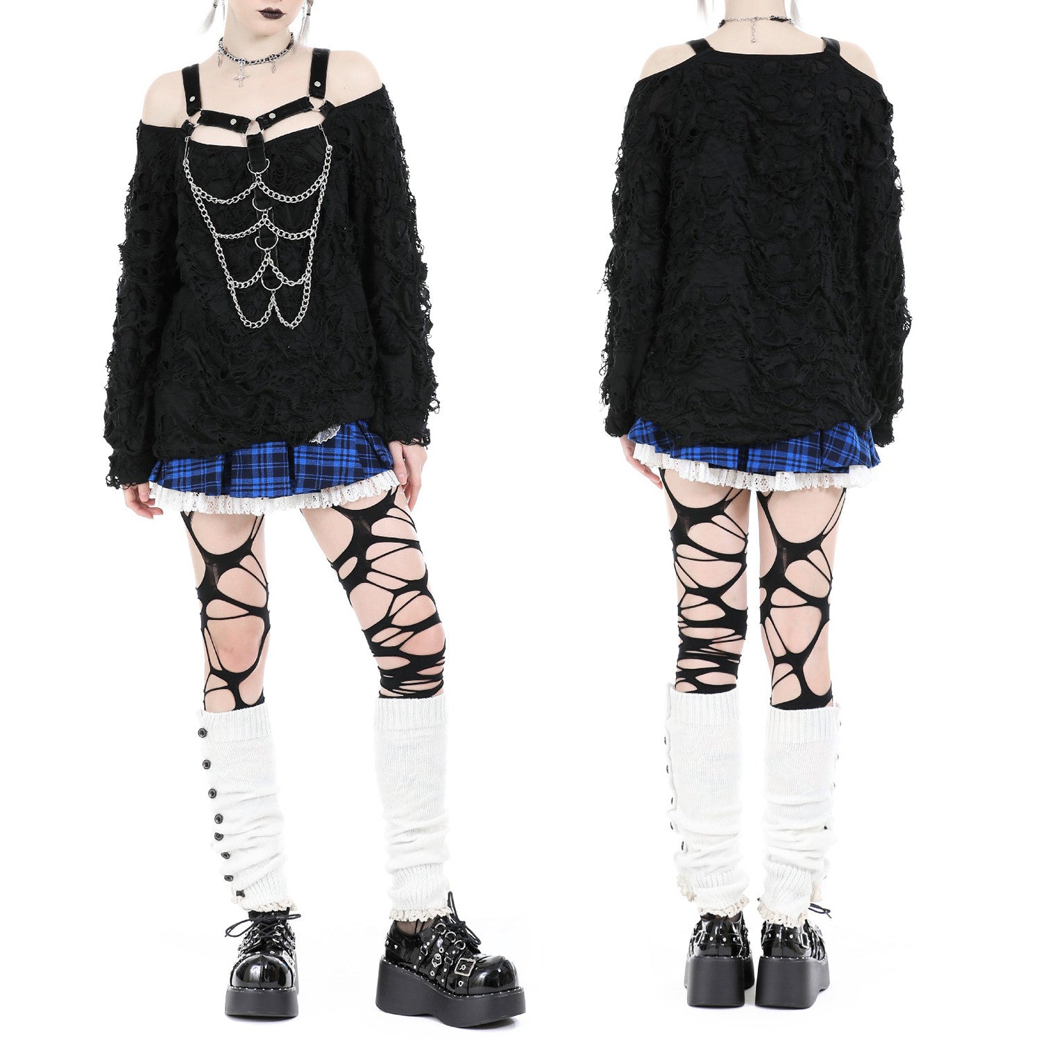 T-shirt ample avec chaînes argentées à l'avant et design déchiré. Les manches longues ont des épaules dénudées avec des bretelles, ajoutant une touche rebelle et accrocheuse. La composition du t-shirt ample avec chaînes est composée de 76 % polyester, 20 % rayonne et 4 % spandex. Parfaite pour se démarquer lors d'événements et rencontres de mode gothique, alternative et punk. Faites une déclaration de style avec ce vêtement unique !