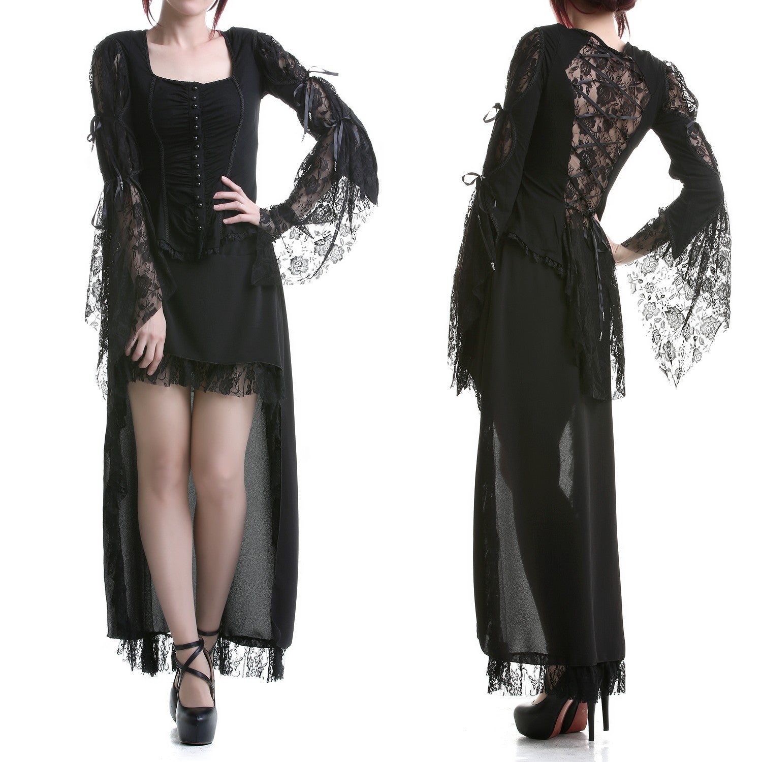 T-shirt noire avec boutons décoratifs à l'avant. Manches larges en dentelle avec rubans. Dos transparent en dentelle avec traîne et croisé.