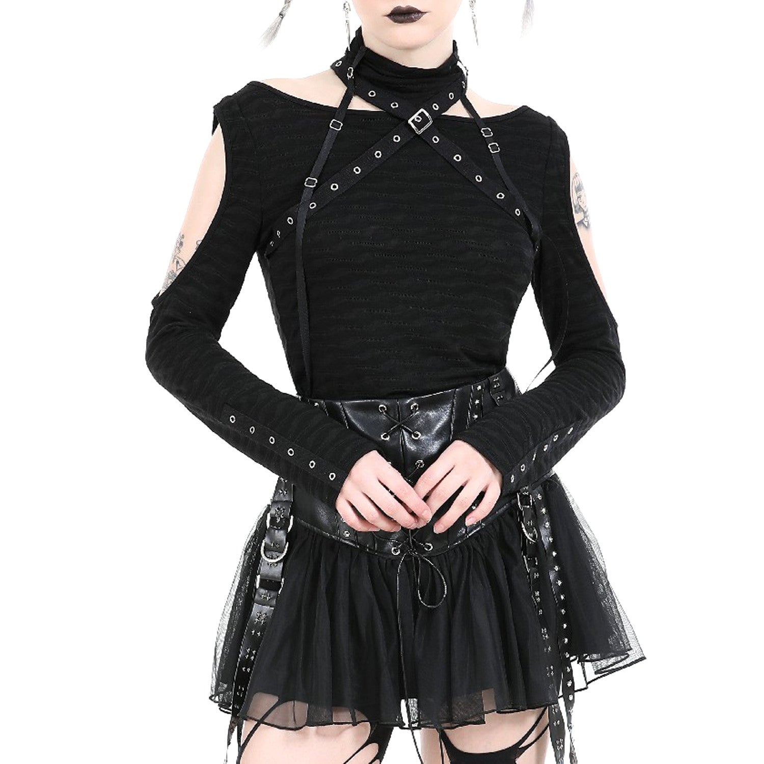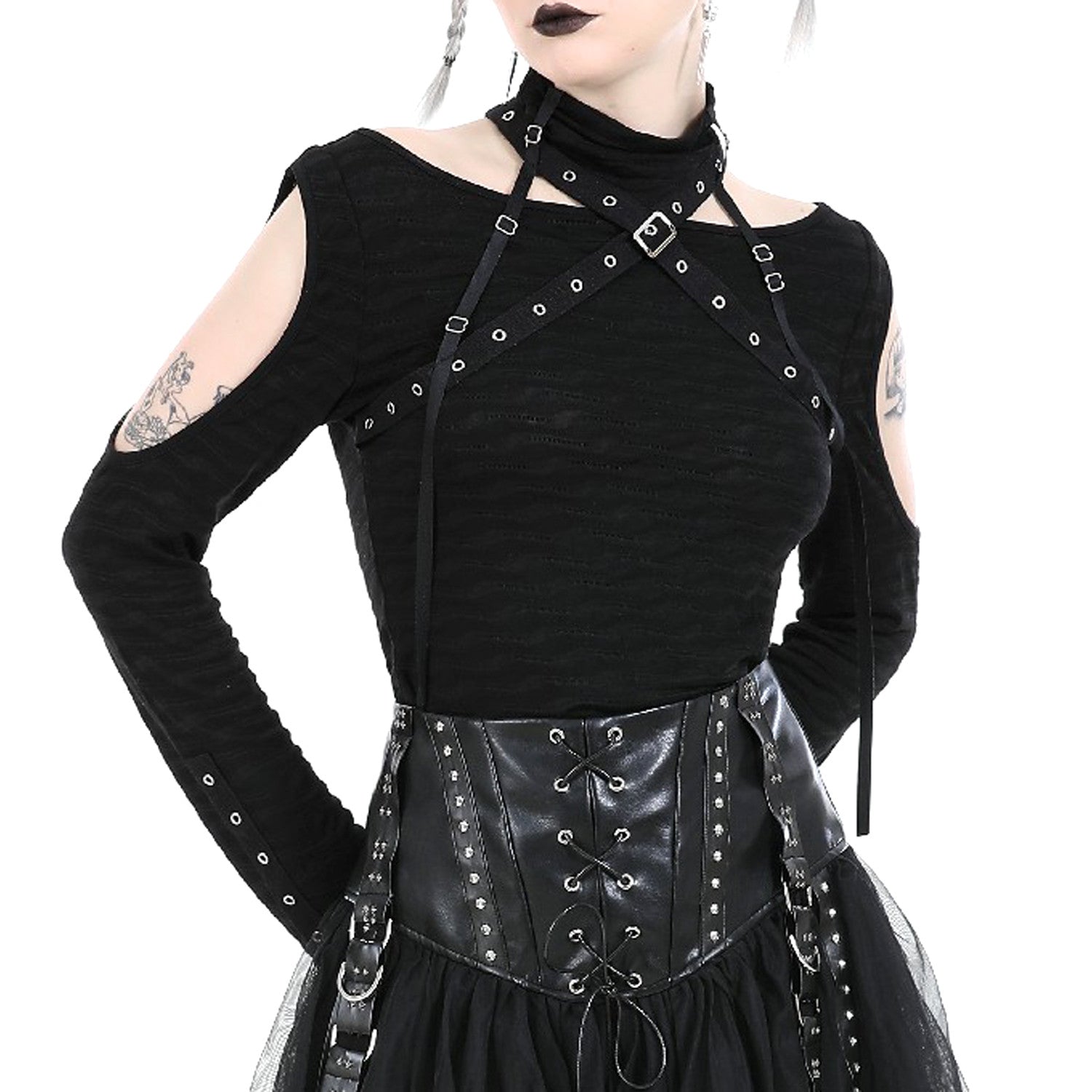 Démarquez-vous avec ce t-shirt accrocheur à boucle qui fusionne des détails uniques avec un style gothique, alternatif et punk. Il présente une boucle à l'avant qui ajoute une touche distinctive, tandis que le col montant et les manches longues renforcent son attrait. La fermeture éclair dans le dos ajoute non seulement un élément fonctionnel mais aussi une touche moderne. Confectionné avec 64 % de rayonne, 33 % de polyester et 3 % de spandex, ce t-shirt avec boucle offre confort et durabilité. Faites une déclaration de mode avec ce vêtement polyvalent qui s'adapte à votre style unique !