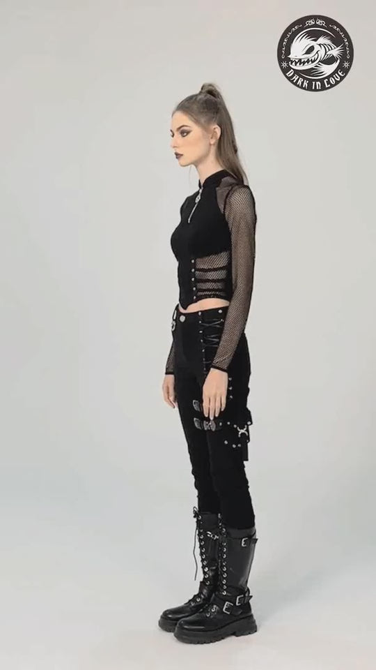 Explorez notre t-shirt en maille avec une fermeture éclair audacieuse au niveau du décolleté et des manches longues transparentes qui ajoutent une touche distinctive à votre tenue punk et alternative. Cette pièce est parfaite pour ceux qui cherchent à se démarquer avec style dans la scène gothique et punk. Confectionné avec un mélange de matériaux comprenant 95 % de coton et 5 % de spandex, ce t-shirt en maille offre à la fois confort et style. Ajoutez une touche de rébellion à votre garde-robe avec ce t-shirt en maille unique et audacieux.