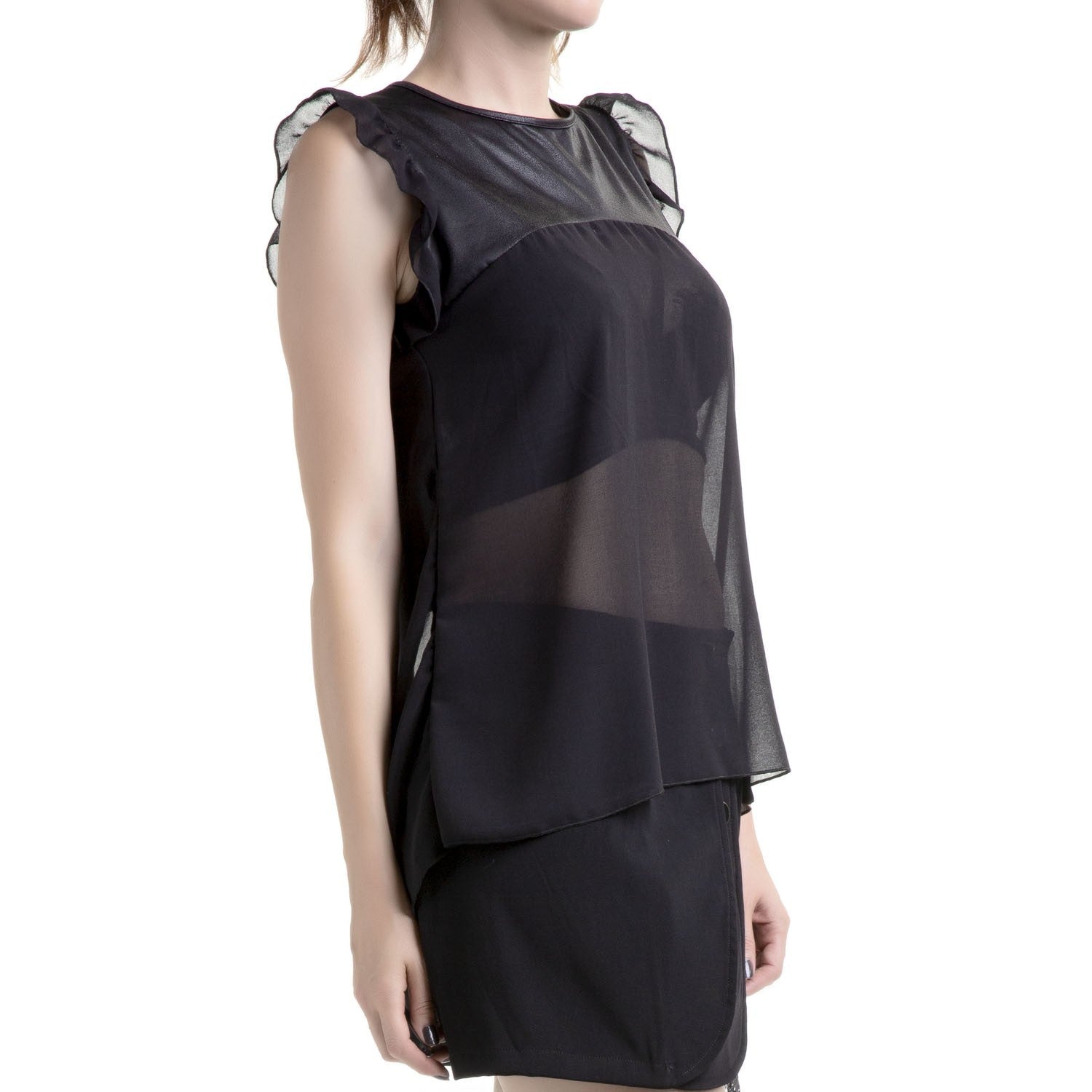 T-shirt en tulle noir, transparent et ample. Similicuir en haut et bretelles avec volants. Dos ouvert.