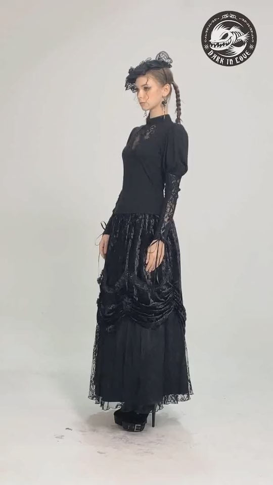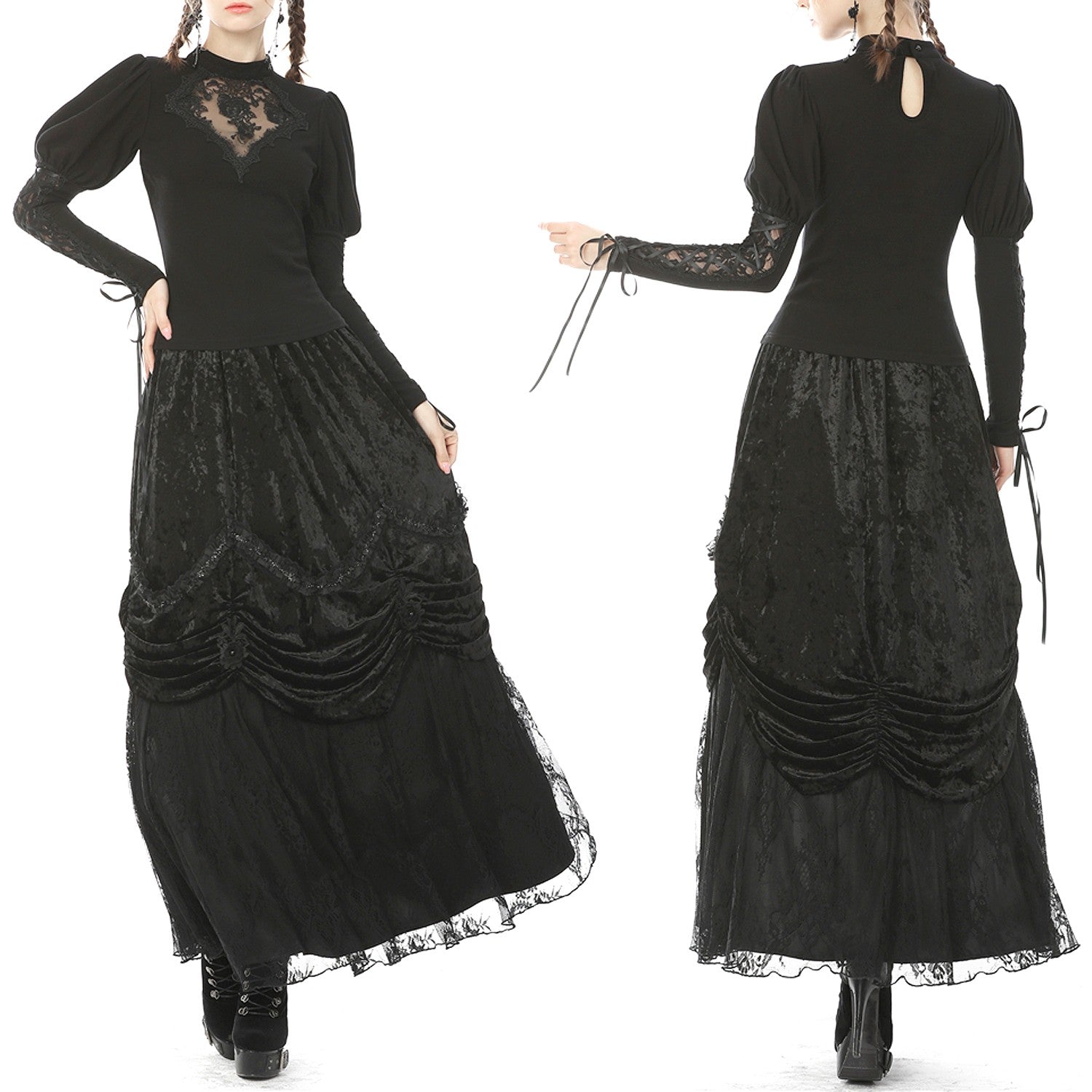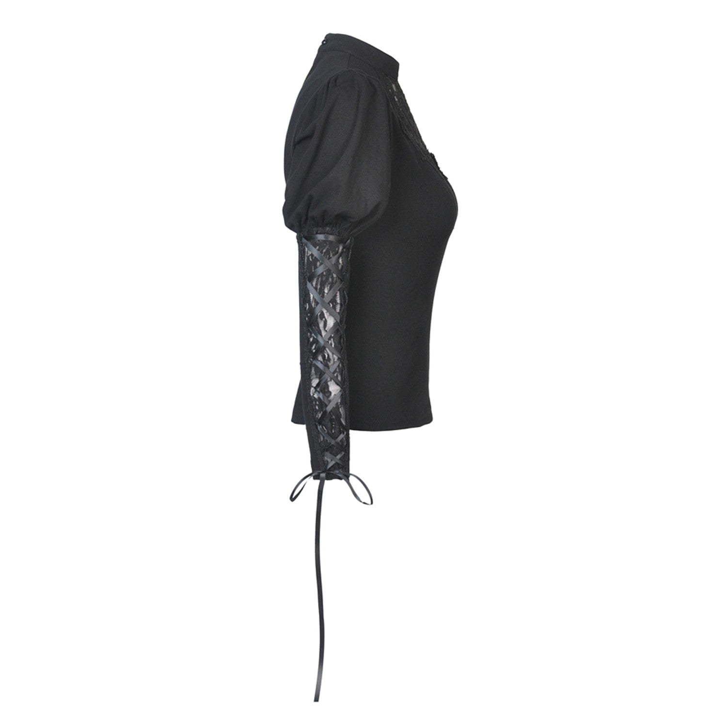 Mettez en valeur avec ce élégant t-shirt noir avec des détails en tulle et guipure au décolleté. Les manches longues présentent de la dentelle, des rubans de satin croisés et des épaules bouffantes pour une touche de style unique. Fabriqué en 95% coton et 5% spandex pour un confort accru et un ajustement parfait.