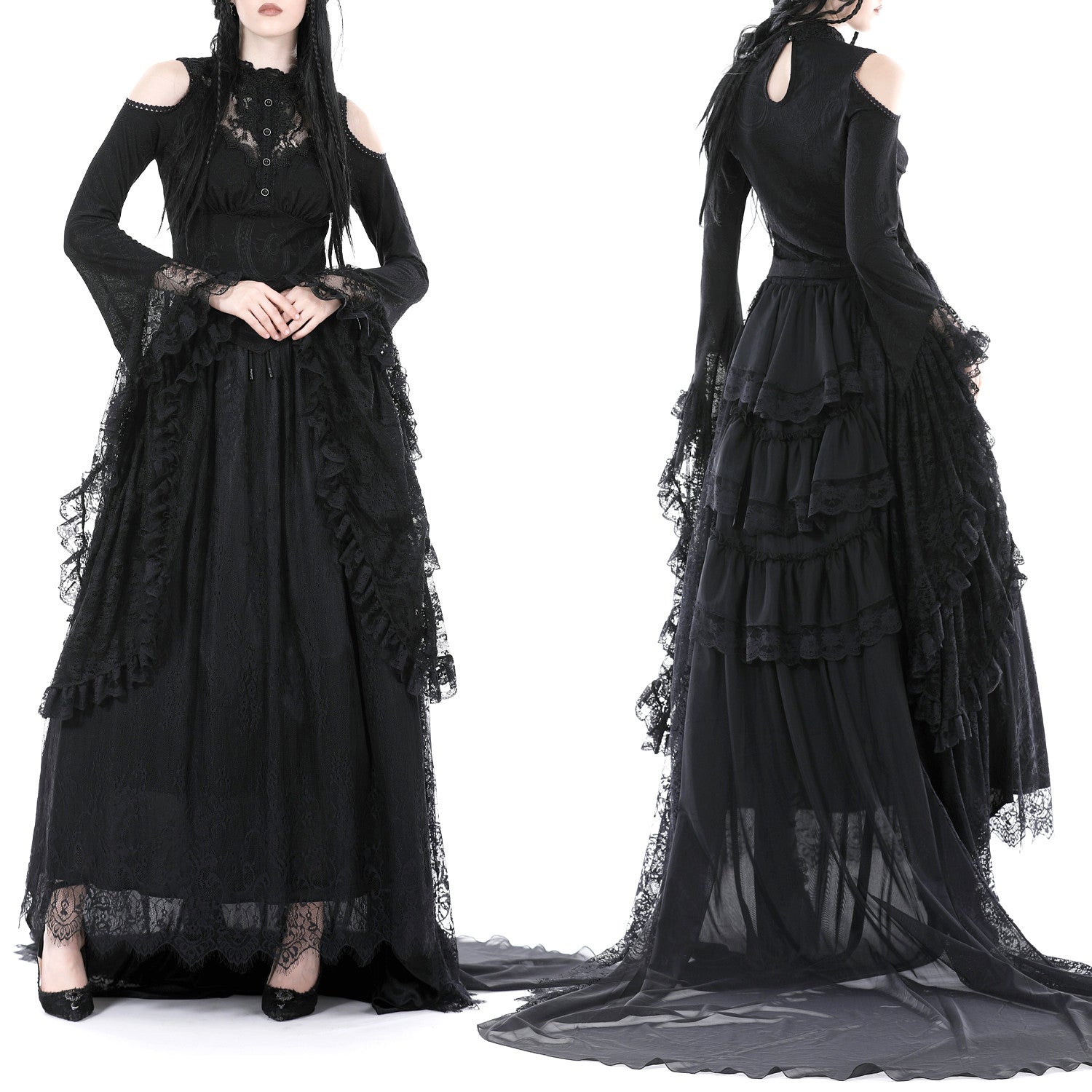 T-shirt noir au style inimitable avec un design de filigranes complexes. Il se distingue par ses manches extra longues ornées de dentelle et ses épaules dénudées. Les boutons et la dentelle au niveau du décolleté ajoutent une touche d'élégance unique. Fabriqué à 100 % en polyester pour un confort durable. Le vêtement essentiel pour ceux qui recherchent un look gothique, alternatif et punk avec style.