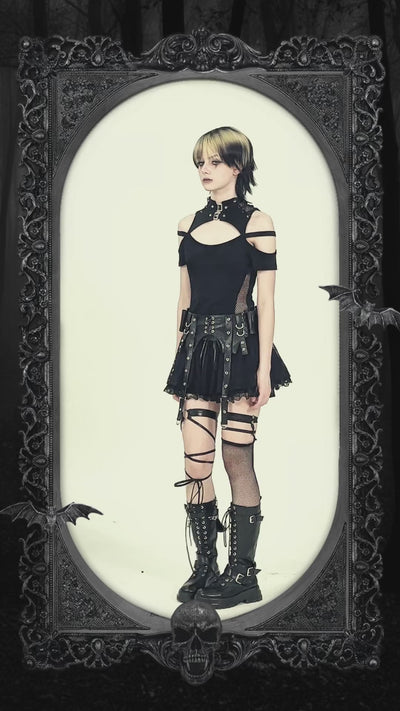 Fantastique t-shirt avec boucles au col et épaules dénudées ! Combiné avec un filet sur les côtés et le col, ainsi que des bandes sur les épaules.