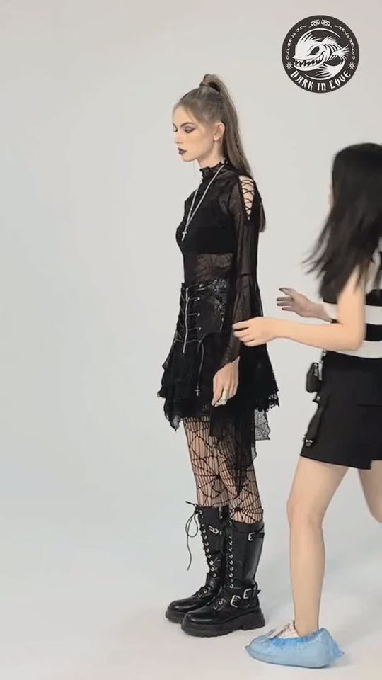 Faites sensation avec ce t-shirt en tulle noir et transparent avec un motif de toiles d'araignée. Les manches extra longues et les lacets croisés sur les épaules ajoutent une touche punk à votre look gothique. Fabriqué à 90 % en nylon et 10 % en spandex, ce t-shirt est confortable et facile à entretenir. Procurez-vous-le dès maintenant dans notre boutique en ligne de vêtements et accessoires gothiques, alternatifs et punk.