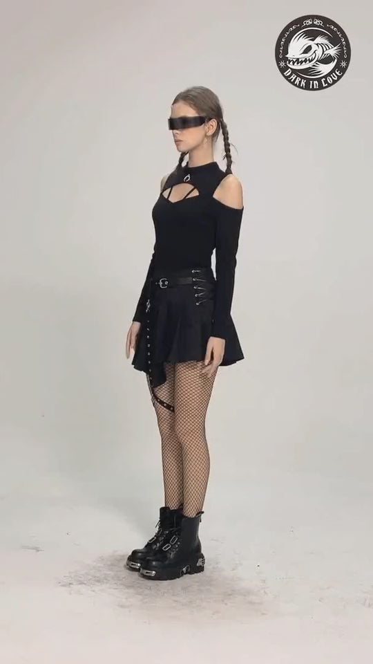 Falda courte, noire, asymétrique et plissée avec un croisé sur un côté et un porte-jarretelles sur l'autre. Elle a une poche et une boucle de type ceinture.