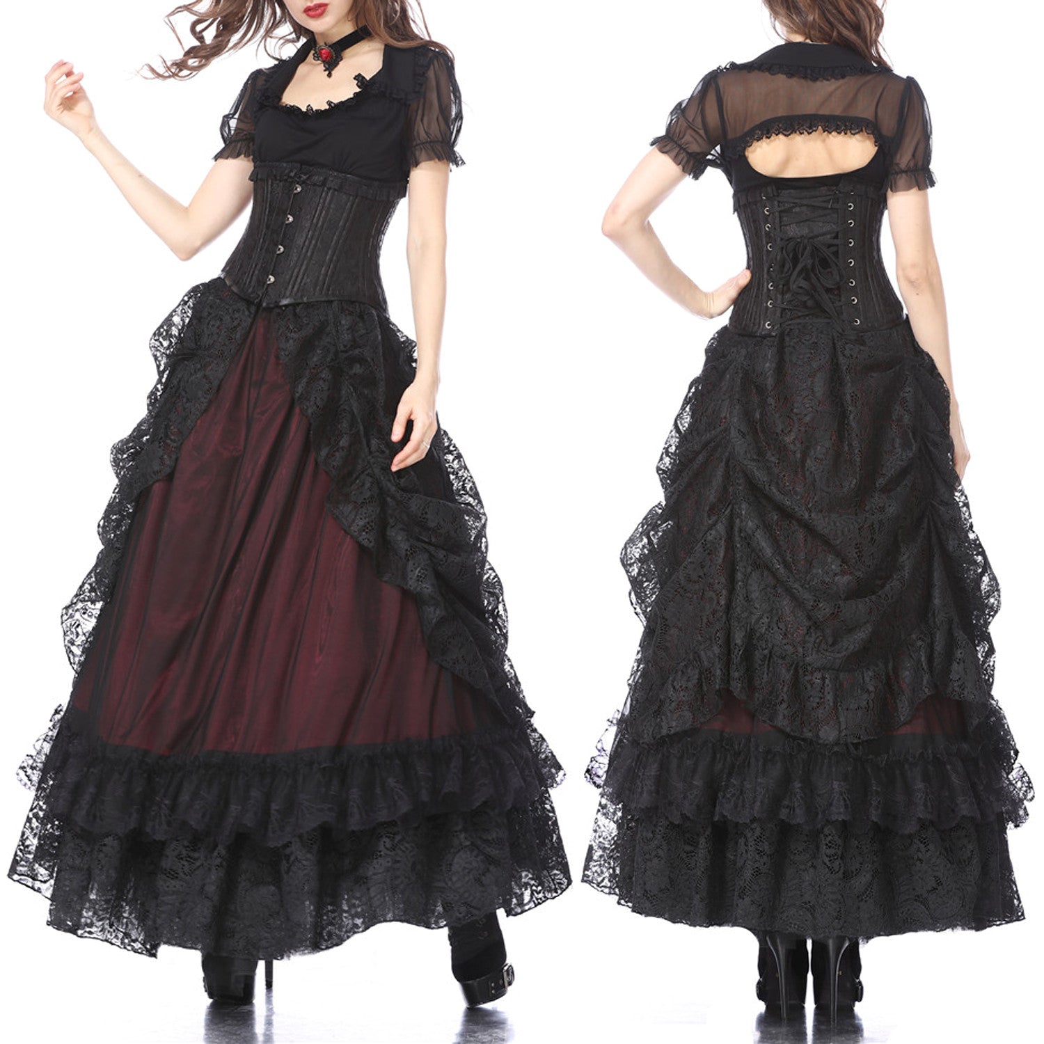 Jupe rouge avec dentelle noire, parfaite pour un look élégant et gothique. Elle dispose d'une taille élastique ajustable avec cordon pour plus de confort. Son design long et fluide est idéal pour toute occasion spéciale.