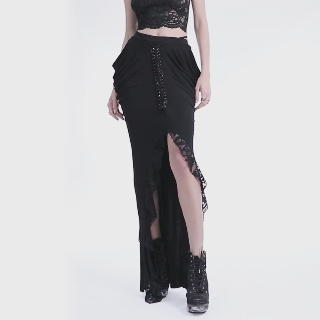 Découvrez un look gothique et élégant avec cette jupe longue noire. Le design style sirène, orné de dentelle et d'anneaux décoratifs à l'avant, crée une apparence sophistiquée et unique. L'ouverture frontale ajoute une touche de drame et de style. Parfaite pour se démarquer en toute occasion.