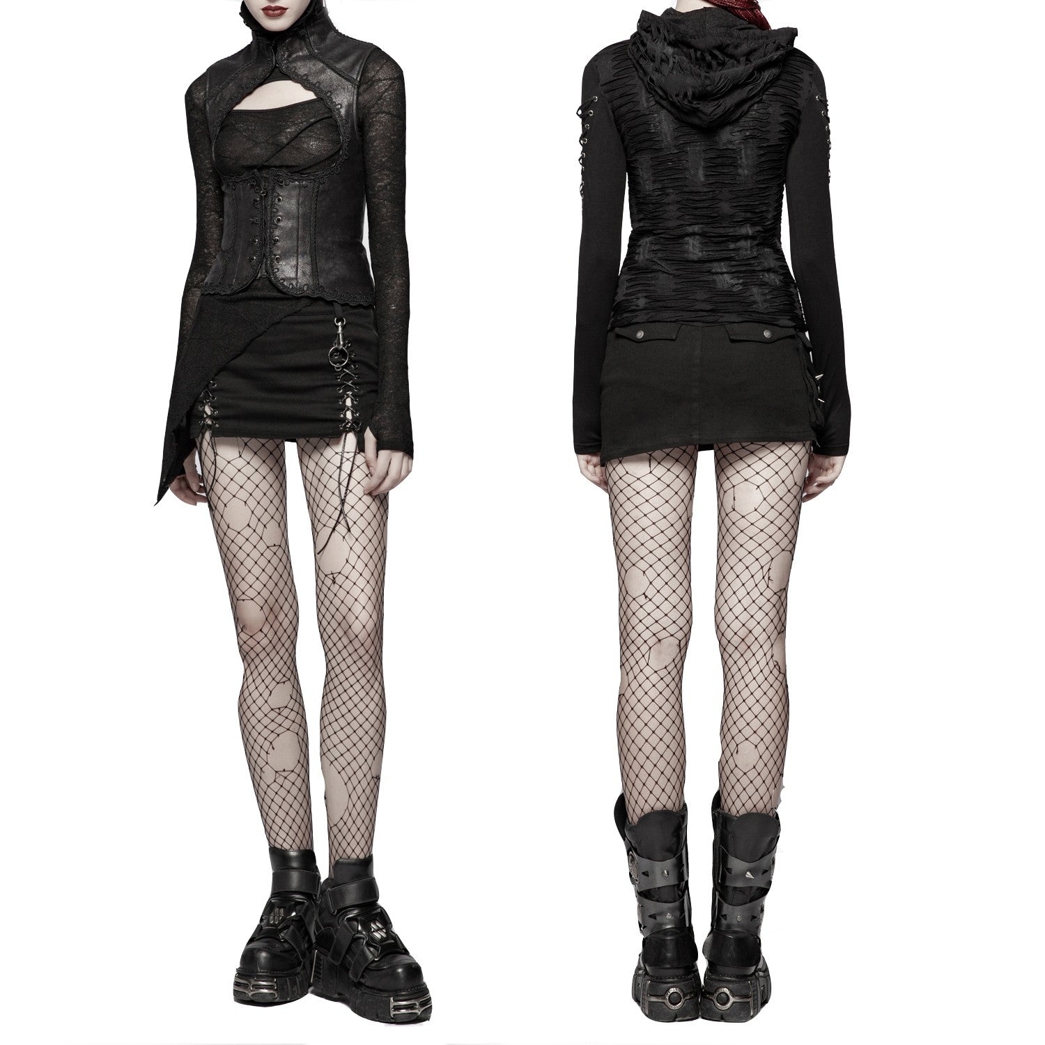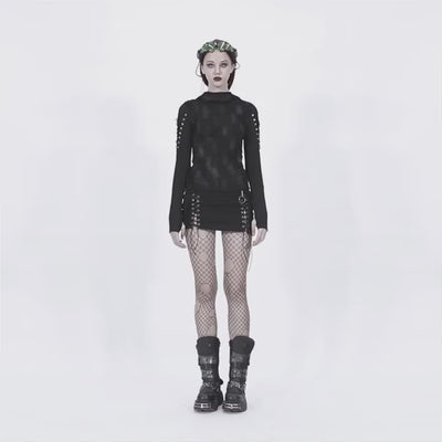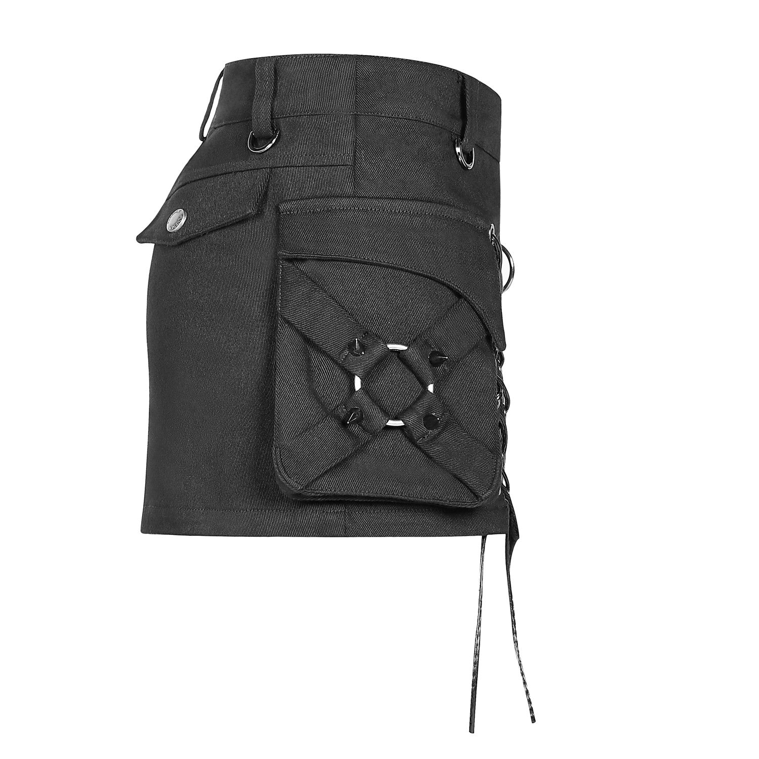 Minijupe noire avec des croisements devant et une grande poche latérale. Coupe asymétrique.