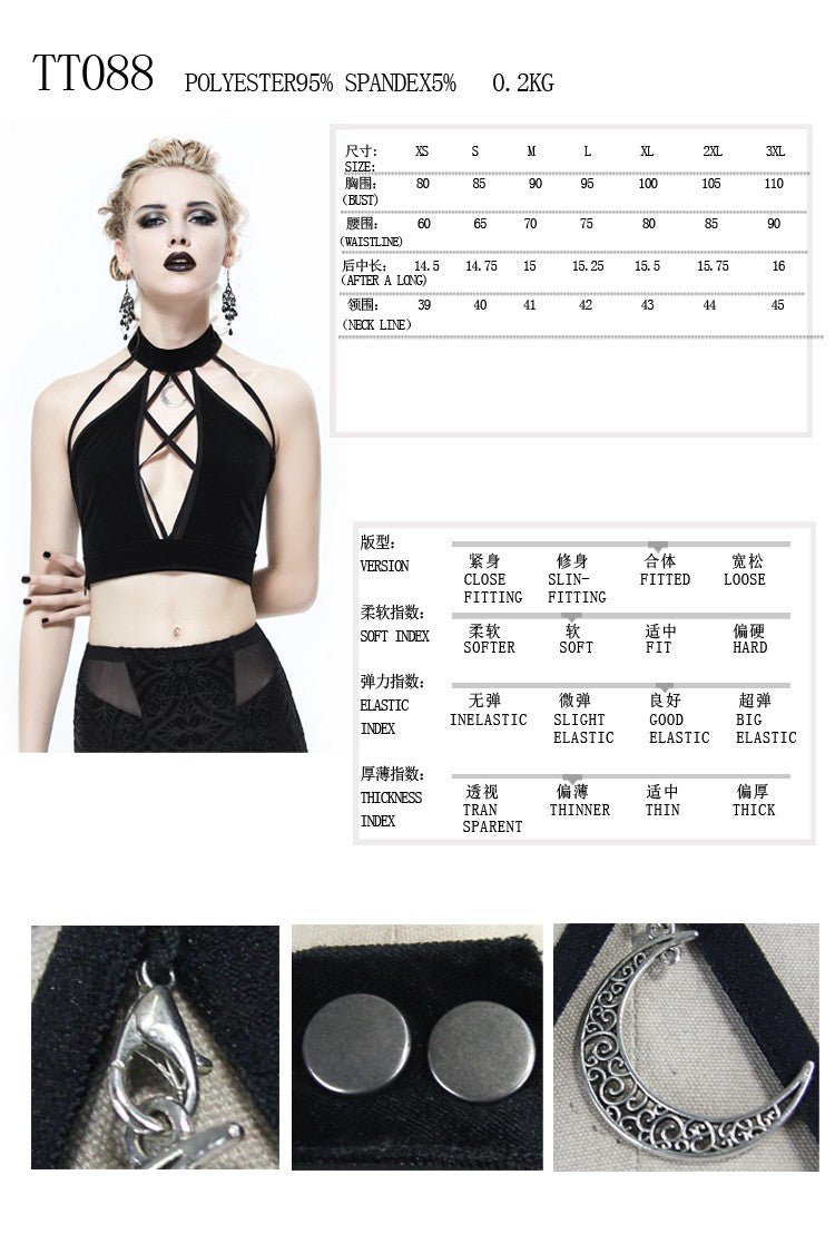 Haut noir et court avec un croisé au décolleté et un pendentif en forme de lune au cou. Boutons dans la nuque.