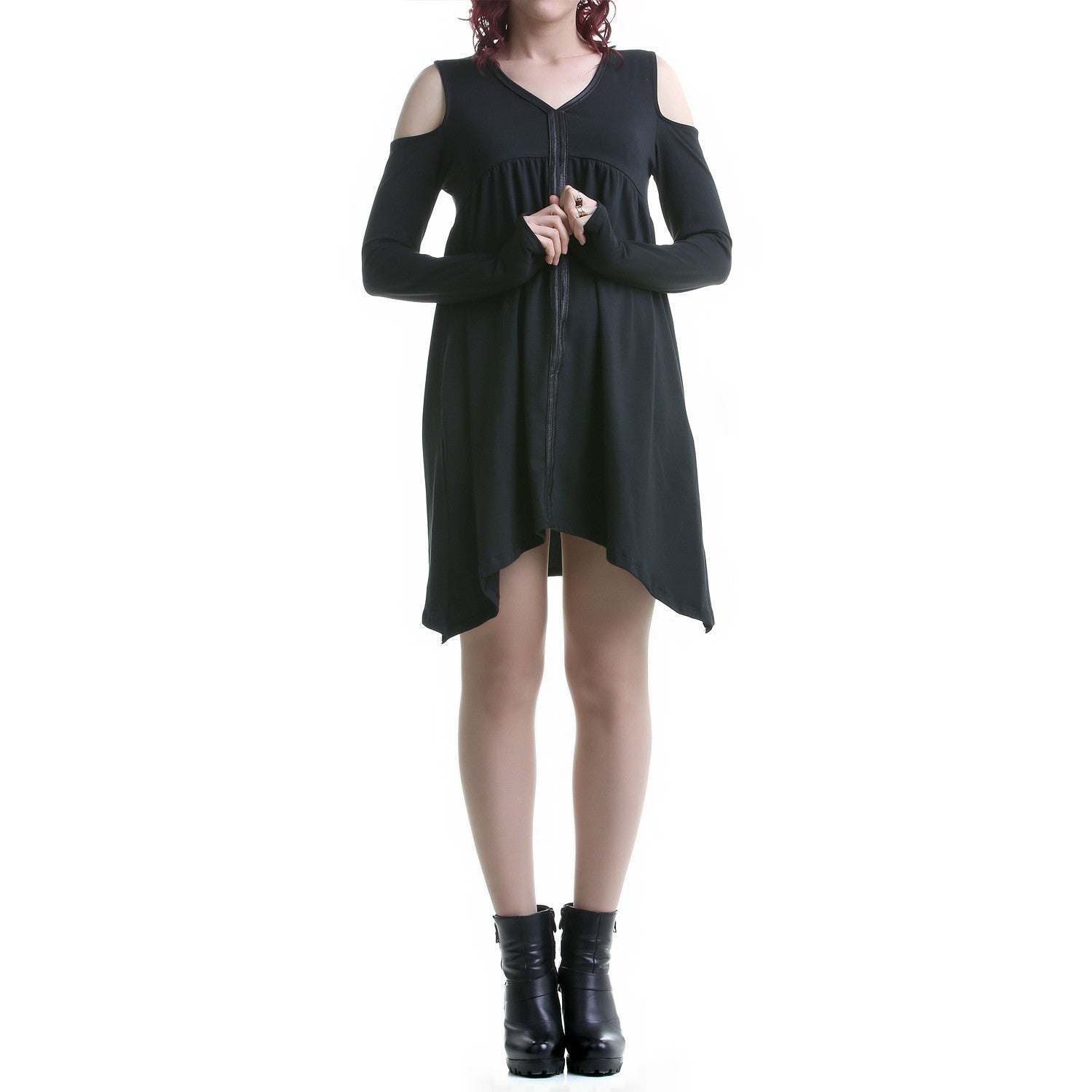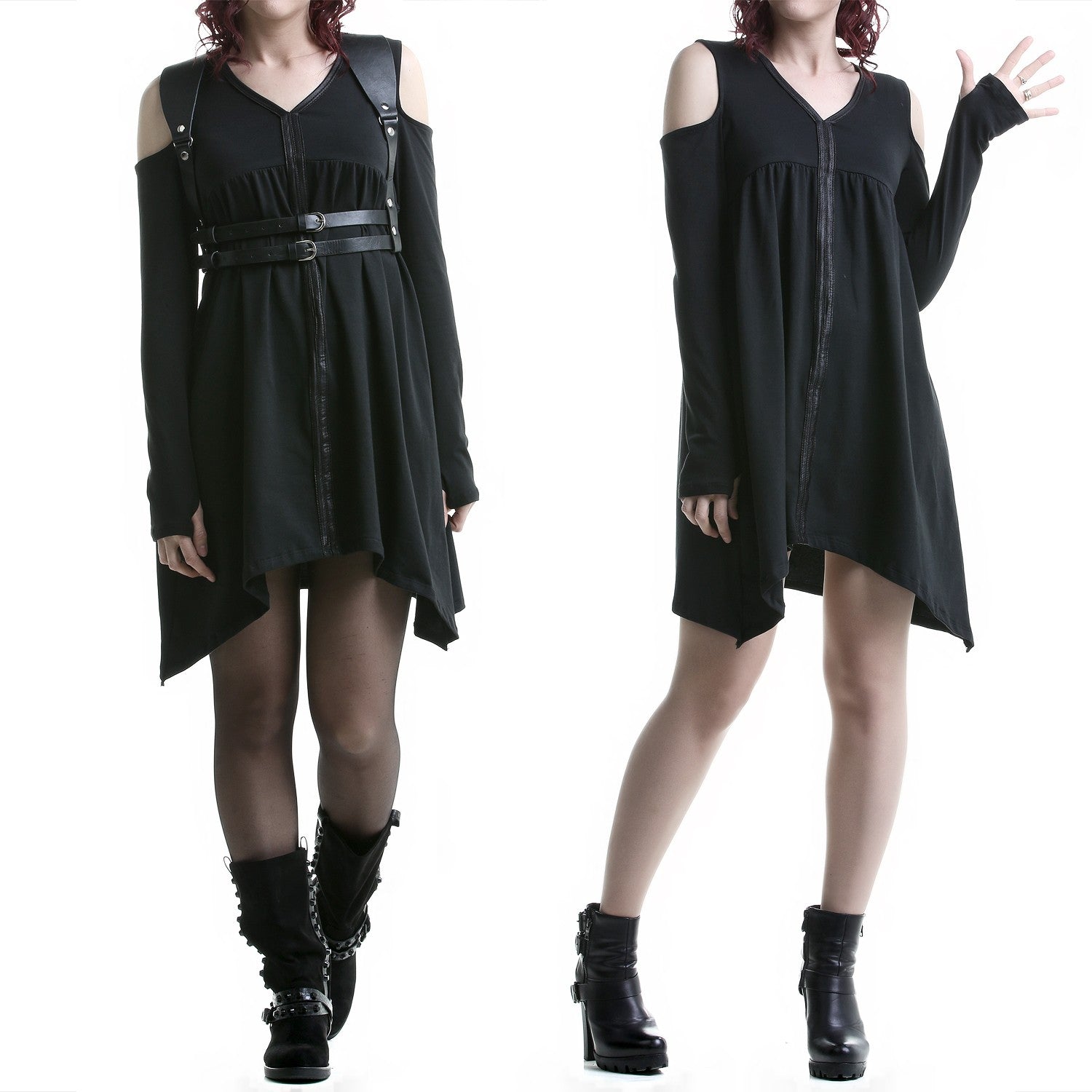 Robe noire et ample avec des bandes en similicuir à l'avant. Manches longues. Épaules ouvertes.