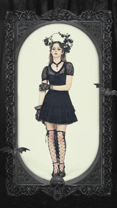 Robe en dentelle de la marque Dark in love, pure élégance et style dans ce design intemporel ! Idéale pour les amoureuses du style gothique/gothique lolita, avec manches courtes en dentelle, jupe avec traîne et volants. Parfaite pour briller lors des fêtes et mariages en y ajoutant une jupe longue !