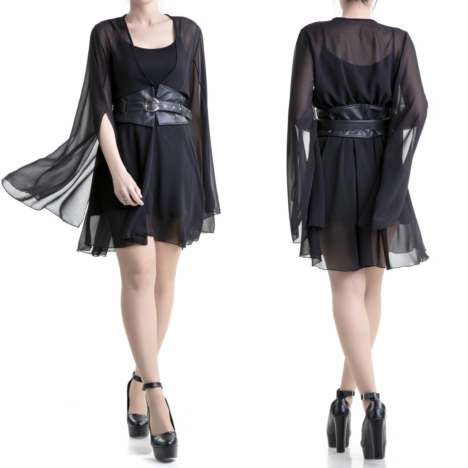 Robe deux pièces, une noire à bretelles et une autre par-dessus en mousseline avec manches longues et larges, décolleté en V.