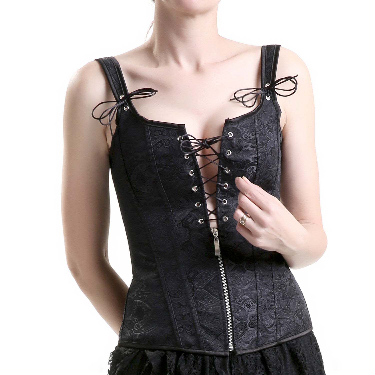 Elegante korset met kruislingse sluiting en ritssluiting aan de voorkant, versierd met strikjes op de bandjes. Het heeft een kruislingse sluiting en een achterpaneel op de rug, met plastic baleinen voor een perfecte pasvorm. Dit korset met kruislingse sluiting en ritssluiting is ideaal voor een gotische en alternatieve look.