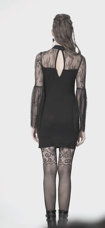 Zwarte korte kokerjurk met lange kanten mouwen en een diagonale overslag bij de halslijn. Mao-kraag. Opening aan de achterkant.