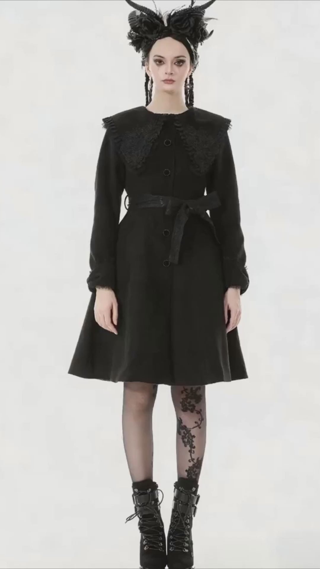 Este abrigo es una pieza de gala que combina una estructura clásica de abrigo de invierno con detalles ornamentales de alta sofisticación gótica.