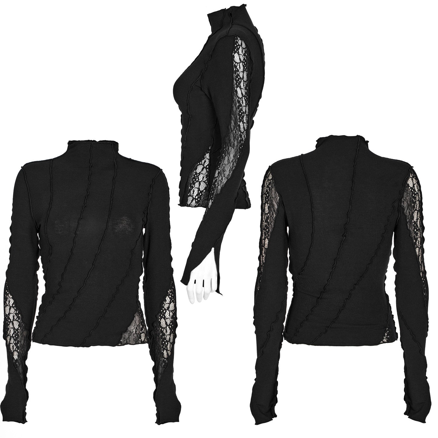 Destaca con nuestra camiseta negra de mangas largas con un diseño de rayas verticales que aporta un toque único a tu estilo gótico y alternativo. Esta prenda se caracteriza por su encaje transparente en los laterales y en las mangas, que añade un elemento de sofisticación a tu look.