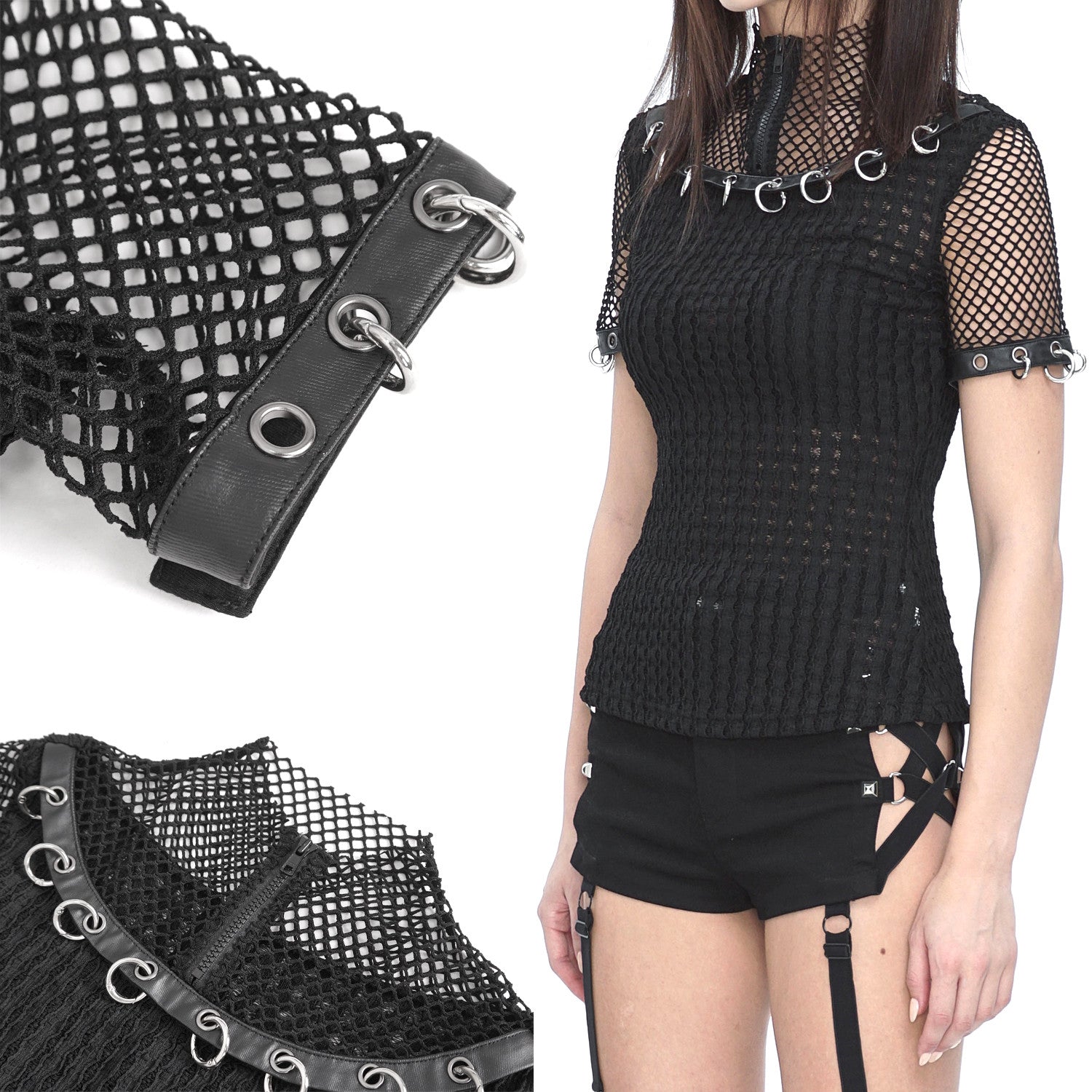 Descubre nuestra camiseta con rejilla y anillas, ideal para un estilo gótico y alternativo. Hecha de tela negra y semitransparente, con mangas y cuello de rejilla que le añaden un toque distintivo. Cuenta con una cremallera en el cuello para mayor comodidad. Composición de la camiseta con rejilla: 85% poliéster, 7% elastán, 5% algodón, 3% viscosa.