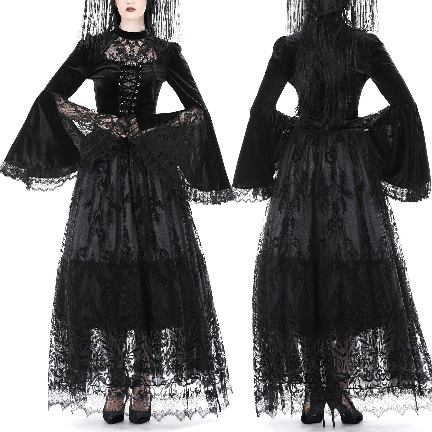 Camiseta de terciopelo negra y elegante con mangas largas y amplias adornadas con encaje. La parte frontal presenta un encaje transparente con cordones cruzados que añaden un toque distintivo. Además, cuenta con una cremallera en la parte trasera para un ajuste cómodo. Fabricada en un 100% de poliéster para garantizar calidad y comodidad duraderas. Una prenda imprescindible para quienes buscan un estilo gótico y alternativo de alta calidad.