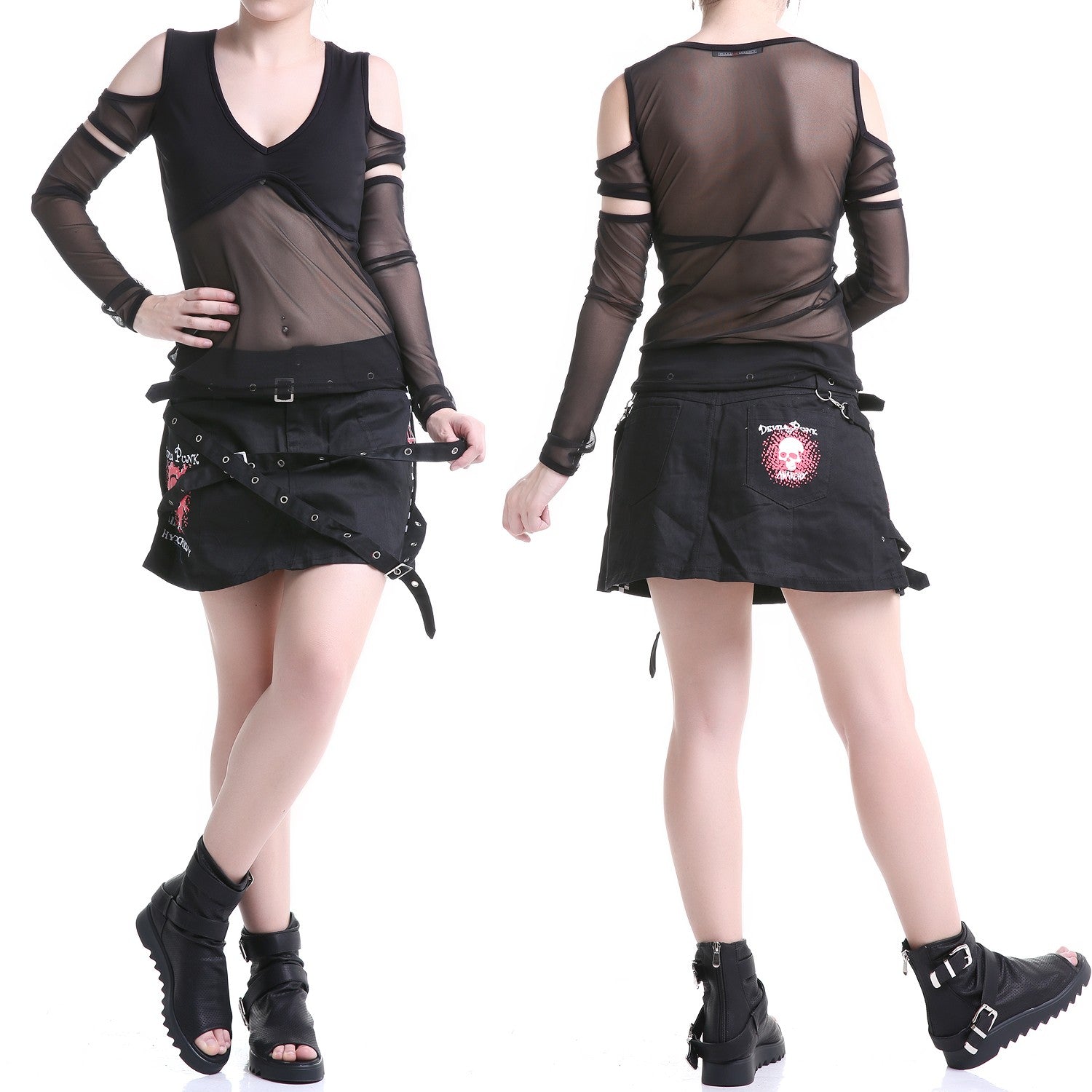 Camiseta negra de tul con escote en forma de V. Es transparente excepto el pecho y los tirantes. Las mangas largas se pueden poner y quitar mediante un imperdible.