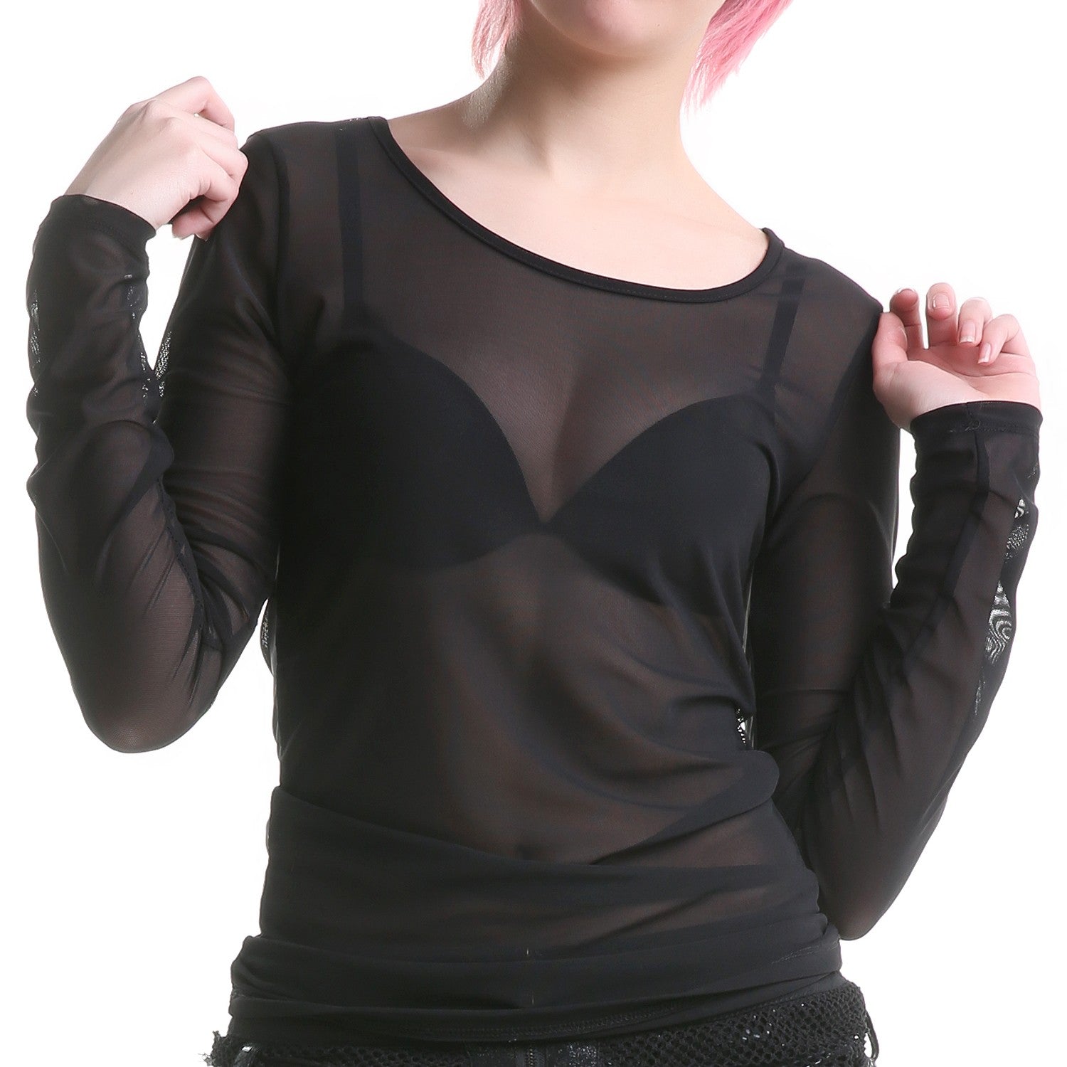 Camiseta negra y transparente de tul. Mangas largas. Escote redondo. Tela elástica.