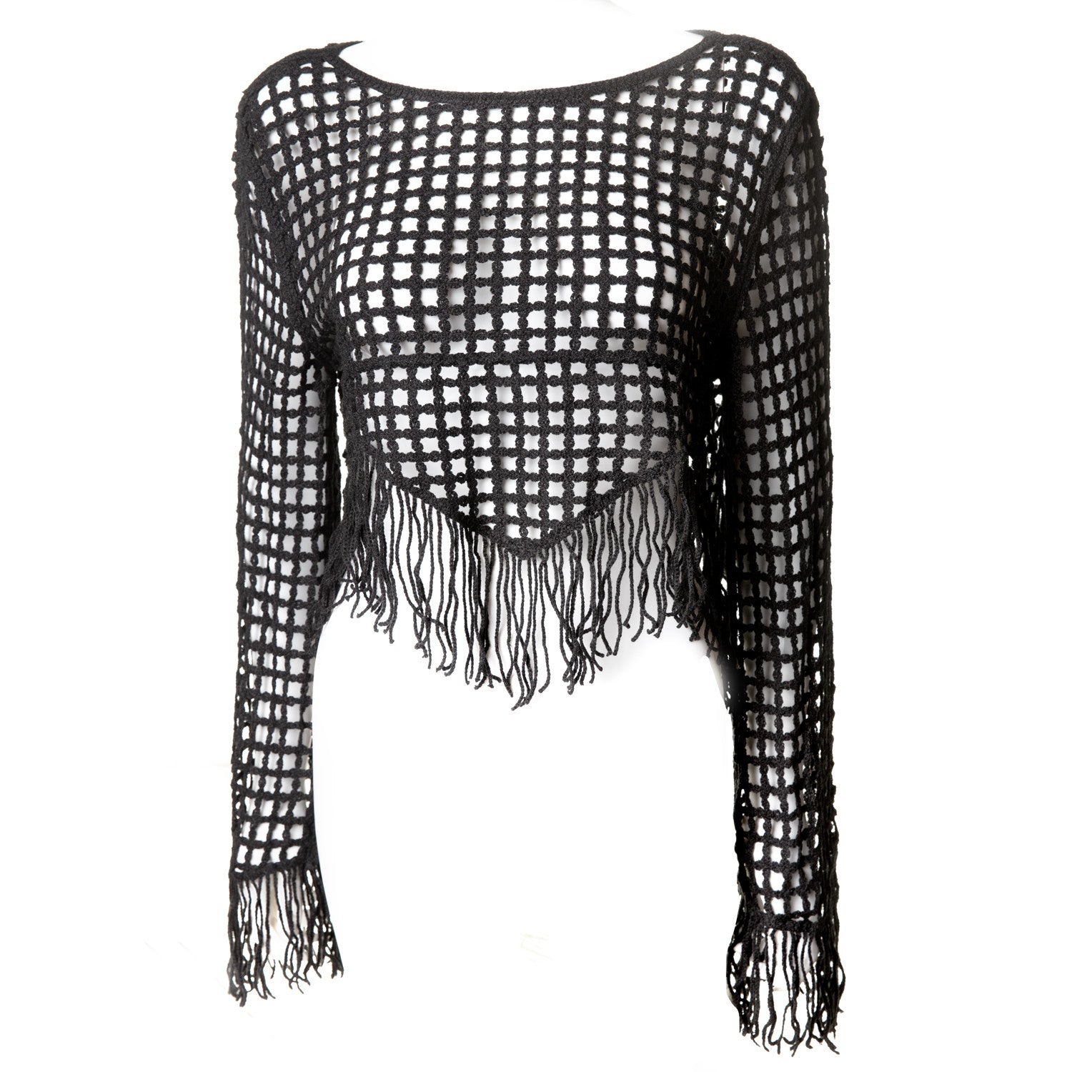 Jersey de punto negro y ancho con flecos, mangas largas y diseño cómodo y ligero. Perfecto para un look gótico casual. Medidas modelo: 86-72-100cm. Altura: 170cm.