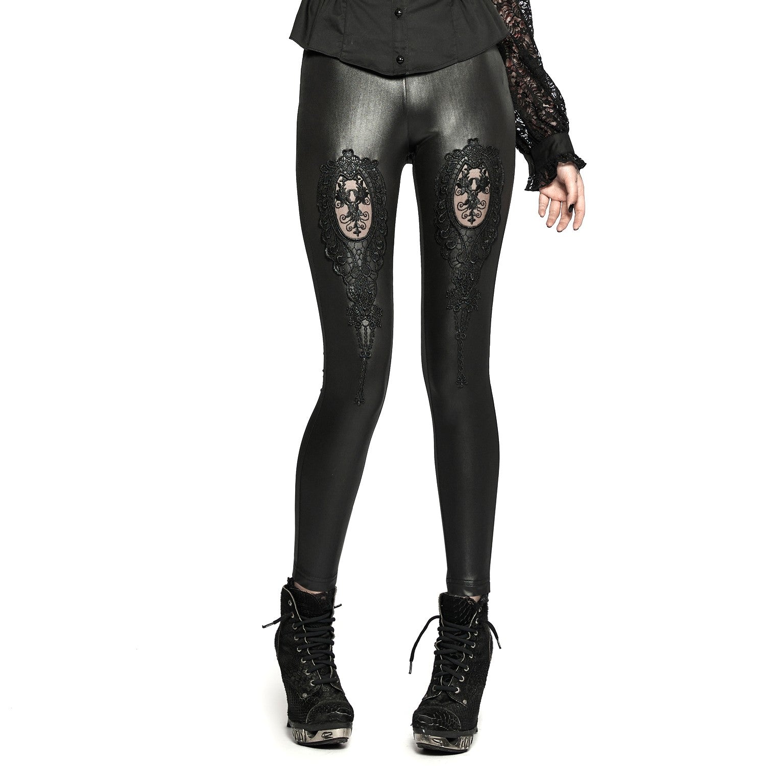 Descubre nuestro impresionante legging negro y brillante estilo polipiel, con un diseño elegante y sofisticado que presenta un hermoso detalle de guipur en la parte delantera de los muslos. Fabricado con una mezcla de 90% poliéster y 10% elastán de alta calidad, este legging es cómodo y duradero al mismo tiempo. ¡Añade un toque de brillo a tu look gótico, alternativo o punk con este legging excepcional! ¡Consigue el tuyo ahora y luce con estilo en cualquier ocasión!