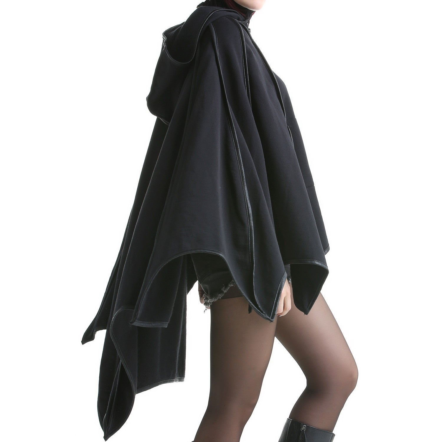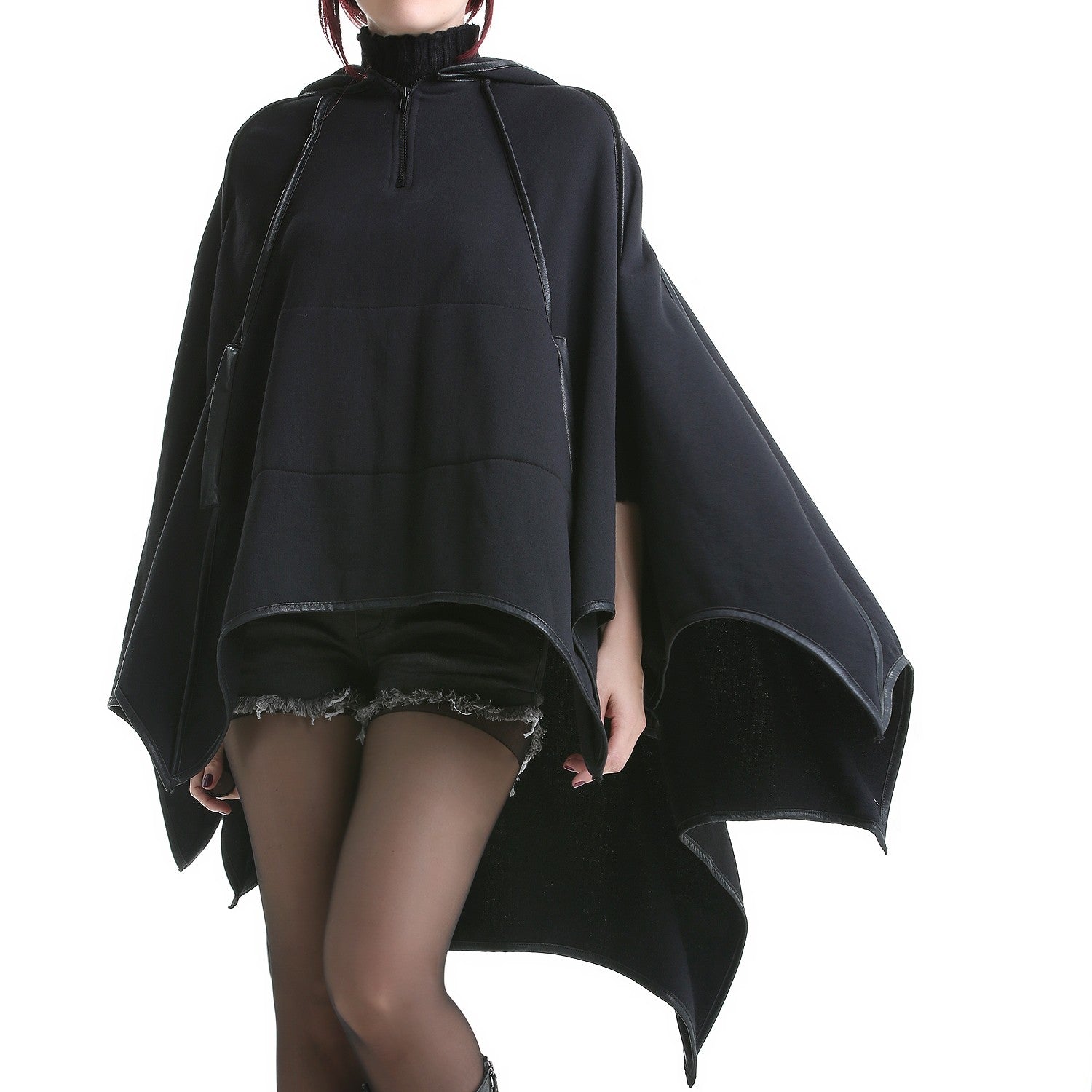 Poncho negro acabado en picos con capucha. Bolsillo y cremallera delante. Es más largo detrás que delante. Rayas negras de polipiel.