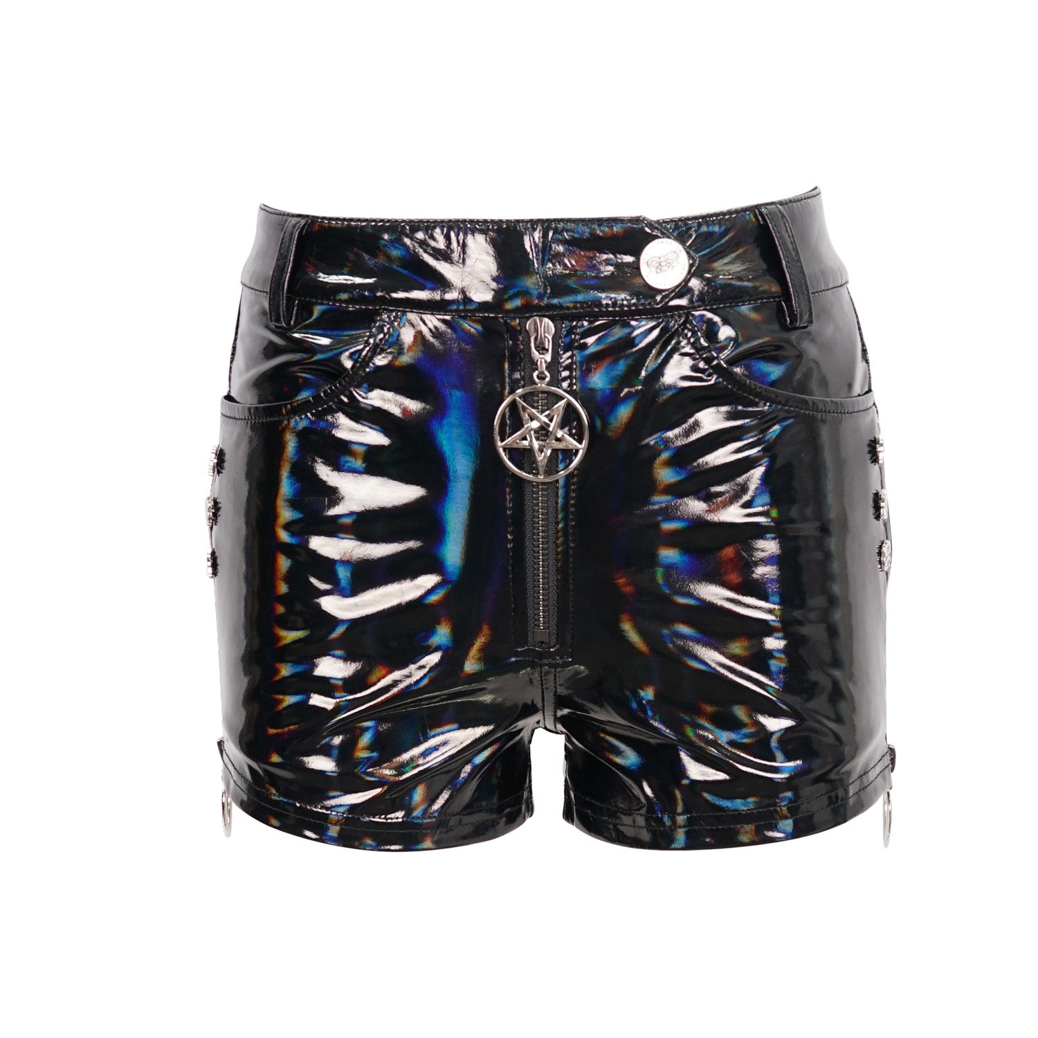 Shorts de polipiel negros con un toque brillante y un pentagrama en la cremallera. Hechos al 100% de cuero sintético. Perfectos para destacar tu estilo alternativo y gótico en cualquier ocasión.