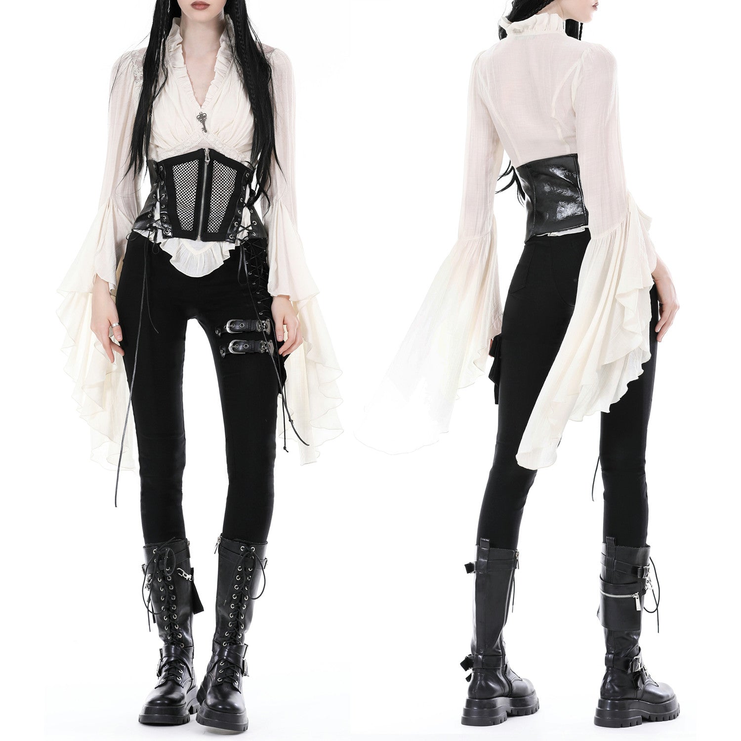 Blusa em branco sujo com um toque de elegância vitoriana. Destaca-se pelas mangas extra longas e detalhes em renda nos ombros. O seu decote em V, realçado por uma chave de bronze, acrescenta um toque distintivo. Fabricada em 100% poliéster para um conforto duradouro. Uma peça essencial para qualquer amante da moda alternativa.