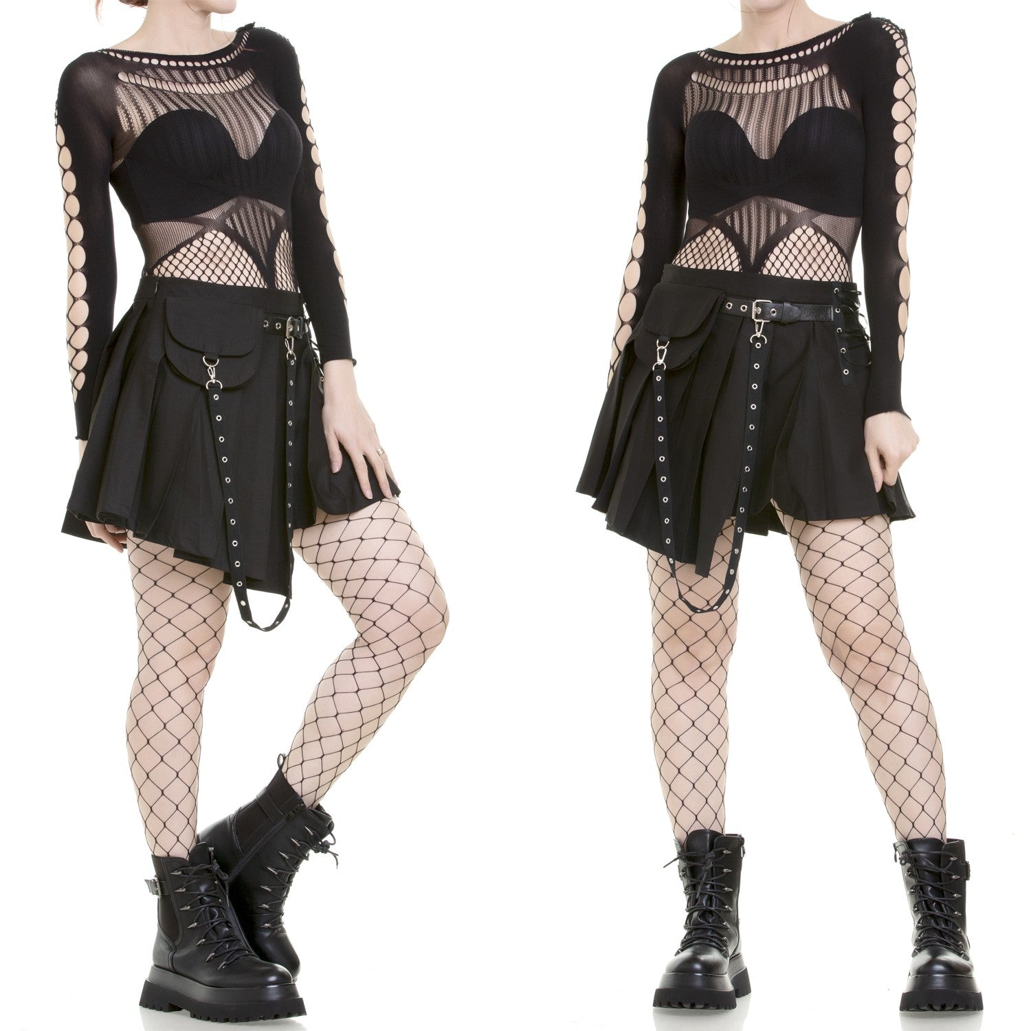 Body elástico e preto com buracos e mangas compridas, perfeito para completar um look gótico, alternativo ou punk. A modelo das fotos mede 170cm de altura e tem medidas de peito 88cm, cintura 72cm e anca 99cm. Encontra este body e mais na nossa loja online de roupa e acessórios alternativos.