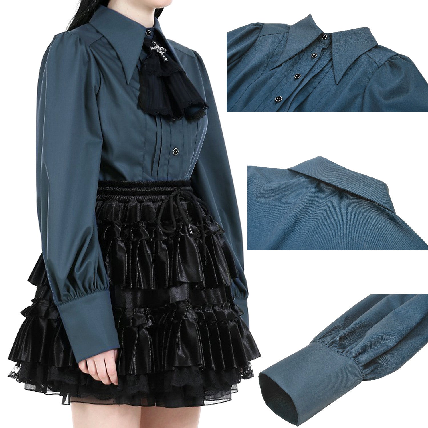 Descubra a nossa elegante camisa azul, uma combinação perfeita de moda gótica e alternativa. Esta camisa apresenta um fecho frontal com botões, mangas compridas e largas, e uma distintiva chorrera preta com uma cruz incluída para um charme adicional. Confeccionada com uma composição de 77% poliéster, 20% modal e 3% spandex, esta camisa azul não só oferece conforto, mas também incorpora um estilo único.