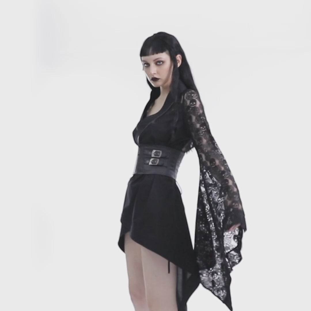 Descubra a nossa elegante camisa com mangas de renda, botões frontais e um sofisticado design de cordões nas costas. Esta peça única combina estilo e conforto, sendo ideal para um visual gótico e alternativo. Composição da camisa com mangas de renda: 92% poliéster, 8% elastano.