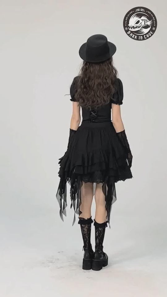 Camisa preta com mangas curtas e largas. Botões à frente e cruzados nas costas.