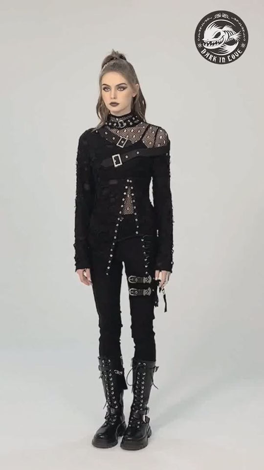 T-shirt preta e assimétrica com fivelas, rede e design rasgado.