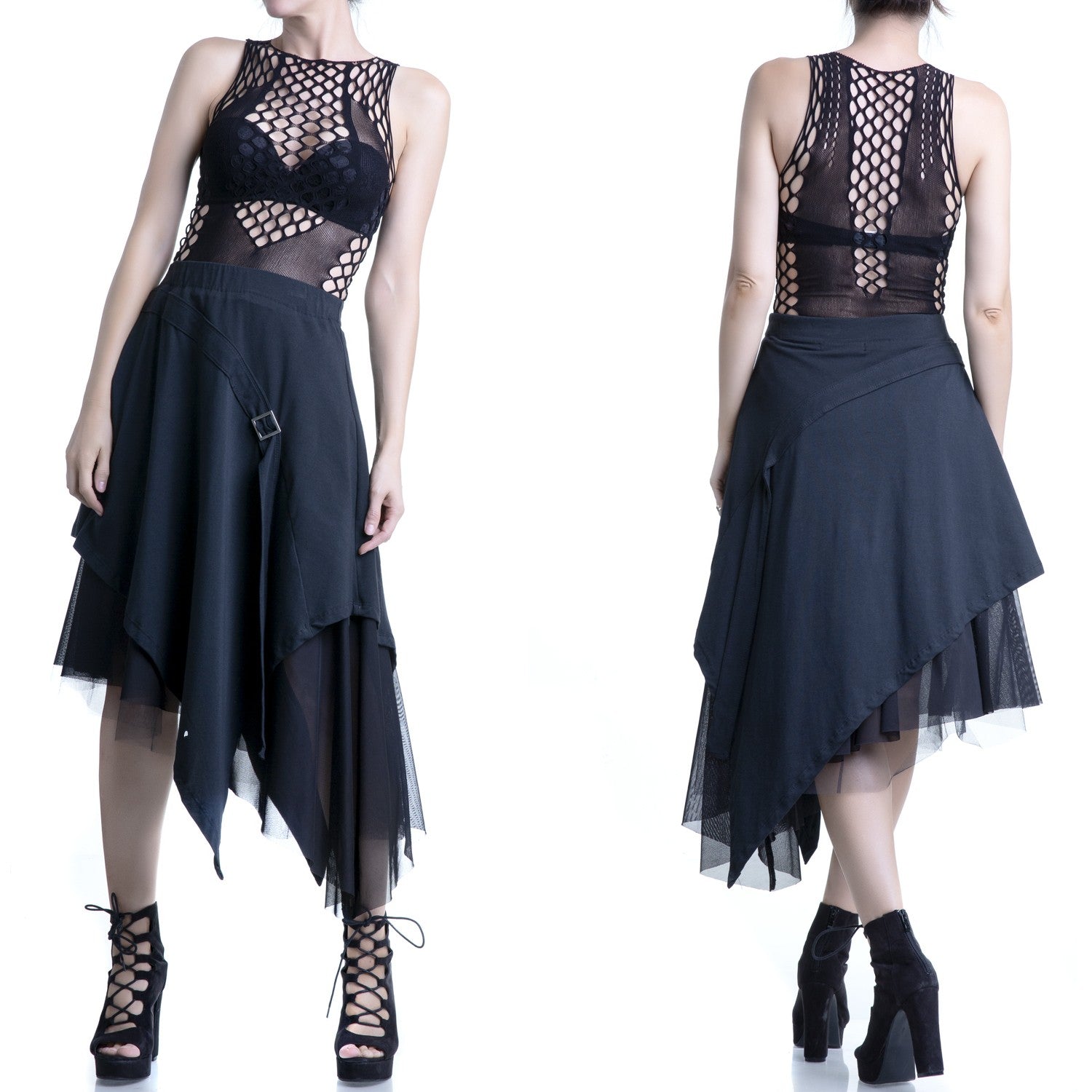 T-shirt preta e transparente com buracos. Tecido elástico.
