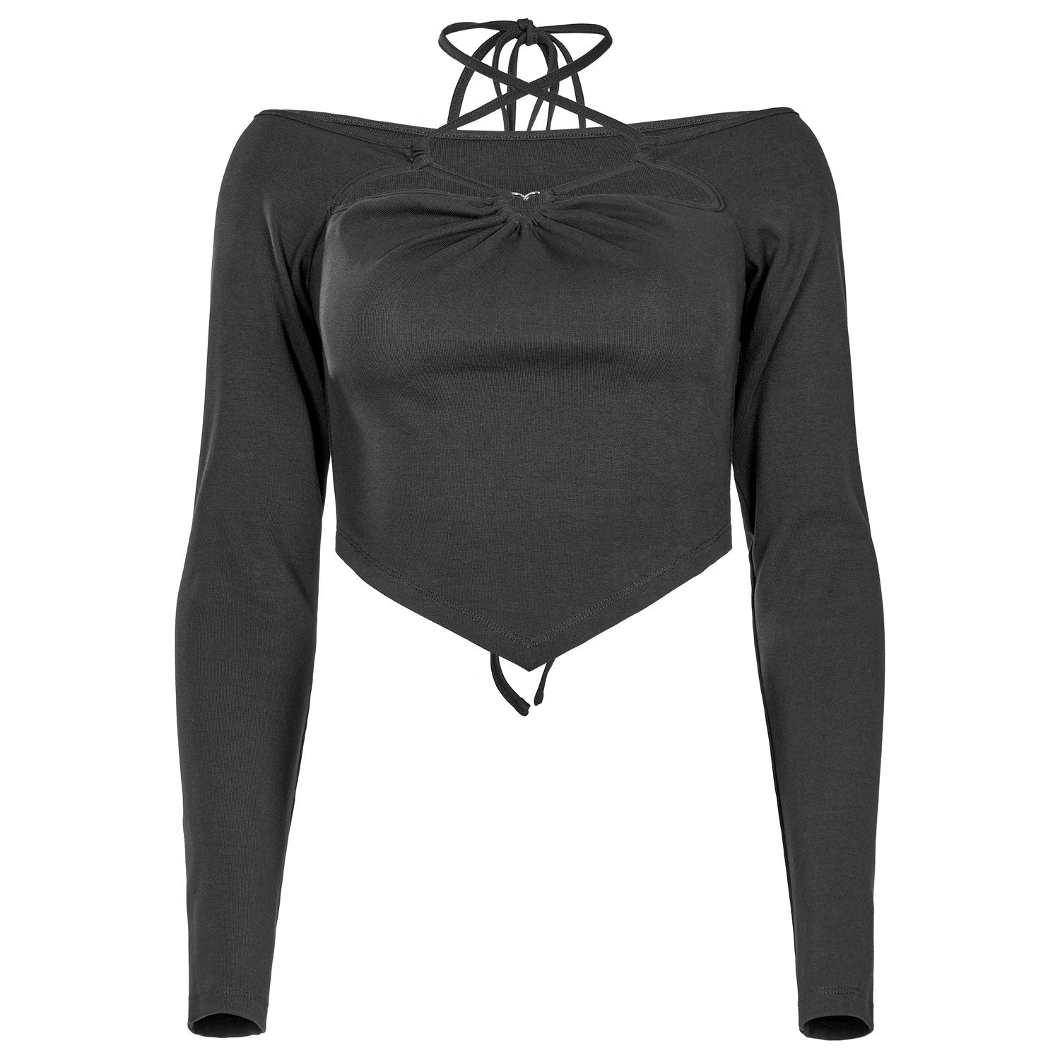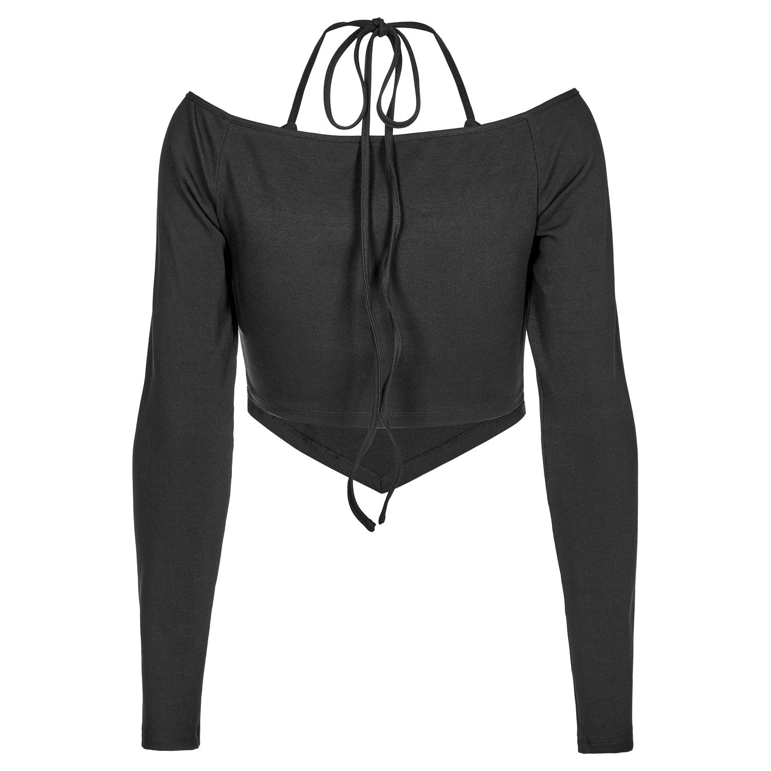 Esta t-shirt cropped de manga comprida é o complemento perfeito para qualquer guarda-roupa gótico, alternativo ou punk. Com ombros descobertos e alças que se amarram no pescoço, é uma peça que te fará destacar. A sua cor preta intensa torna-a uma opção versátil e fácil de combinar. Além disso, é feita com 94% viscose e 6% elastano, o que a torna confortável e resistente ao mesmo tempo. Adquire-a agora e completa o teu look rebelde!