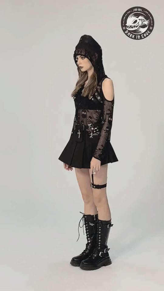 T-shirt preta e transparente em rede com capuz e um design de caveiras. Ombros abertos e fecho éclair no decote.