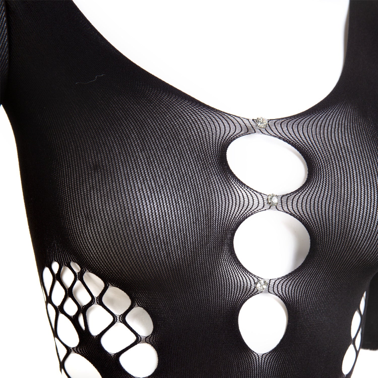 T-shirt elástica com buracos decorativos nas laterais, mangas e decote, que lhe conferem um toque distintivo e rebelde. Apresenta mangas semi-longas para maior conforto. Fabricada em tecido preto altamente elástico, esta t-shirt elástica com buracos ajusta-se perfeitamente ao corpo e é ideal para completar o teu estilo gótico, punk ou alternativo.